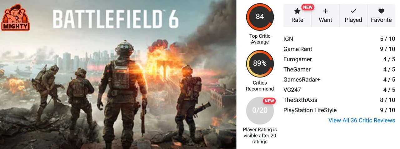 ⚡️Появились первые оценки Battlefield 6 — шутер получил 84 балла на OpenCritic, это прекрасный результат для мультиплеерной игры.