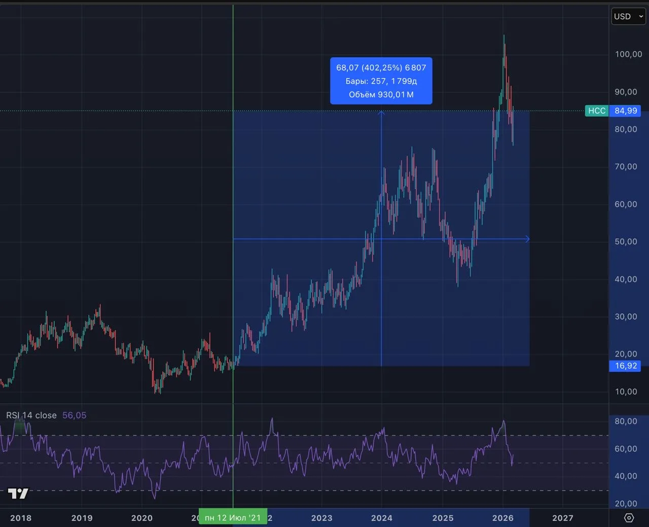 В случае с HCC летом 21 было ровно наоборот: забастовка, мрачные заголовки, слабые цены на уголь. Акцию никто не хотел. Именно поэтому она стоила $16.