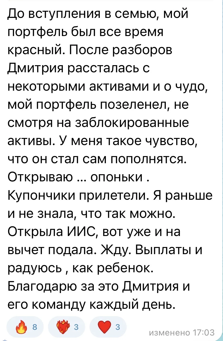 Сейчас я вижу такие же возможности на российском рынке. Многие отвернулись от него, от конкретных отраслей и компаний и не понимают, что сейчас и открываются возможности для создания капитала. В Семье я веду для ребят портфель акций и как раз такие идеи и покупаю.