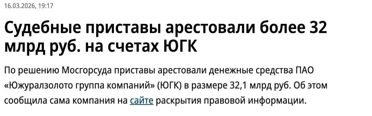 И вот подтверждение: 13 марта судебные приставы арестовали денежные средства ЮГК на сумму 32,1 миллиарда рублей в рамках исполнительного производства по решению Московского городского суда.