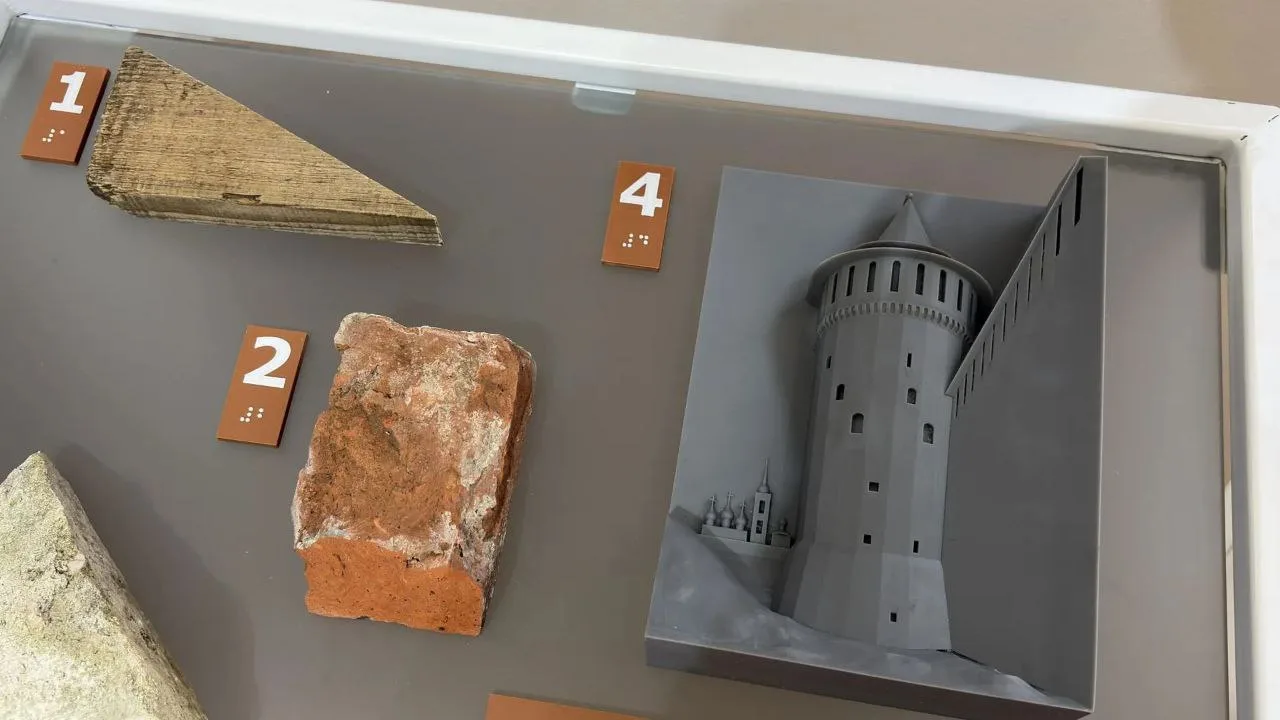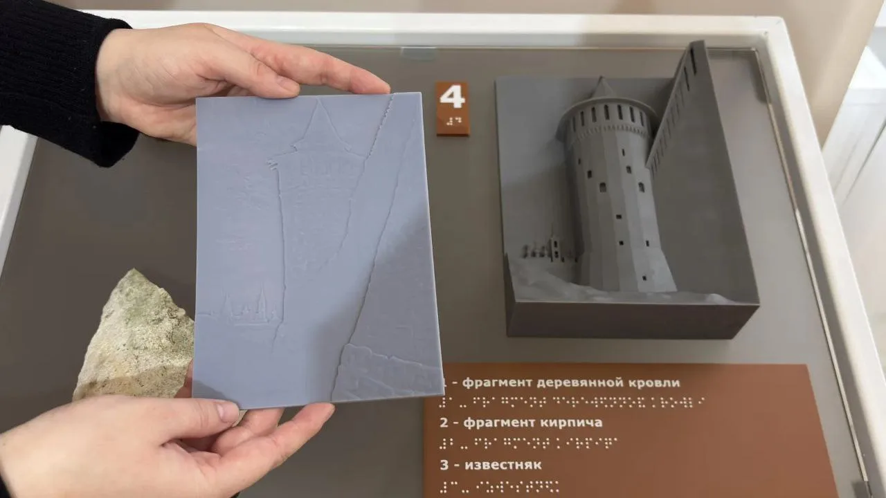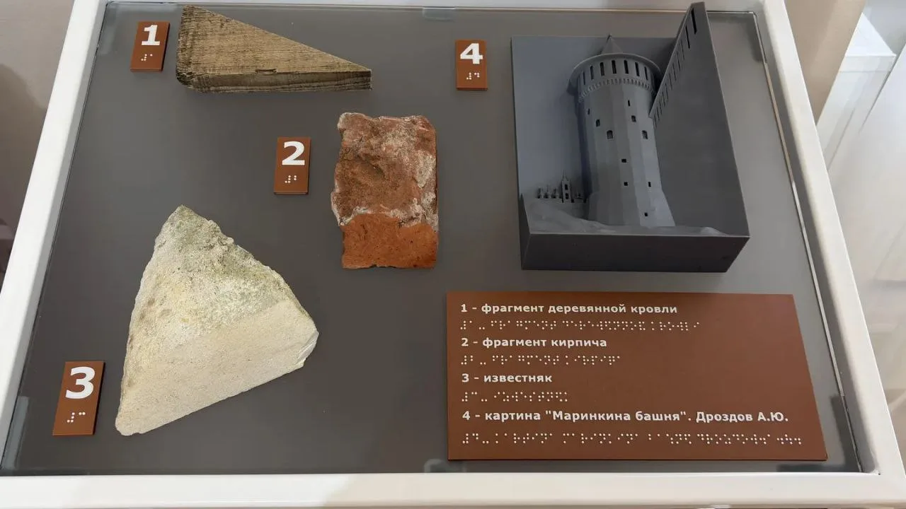 «В ходе переработки картины Андрея Дроздова „Маринкина башня“, обнаружился один достаточно интересный момент. Часть контрфорса, который хорошо виден на картине, на переднем плане, для слабовидящих был непонятным объектом. Поэтому на тактильной скульптуре он был убран, чтобы было понятно, что это идет стена у нас. Также помимо самой картины мы поместили сюда фрагмент кирпича, деревянной кровли и известняка, чтобы можно было, так скажем так, прикоснуться к древнему кремлю», — поделилась тонкостями Юлия Зимина.