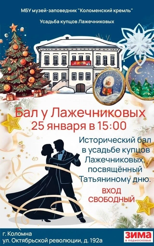 25 января в 15:00 состоится исторический бал в усадьбе купцов Лажечниковых, посвящённый Татьяниному дню.
