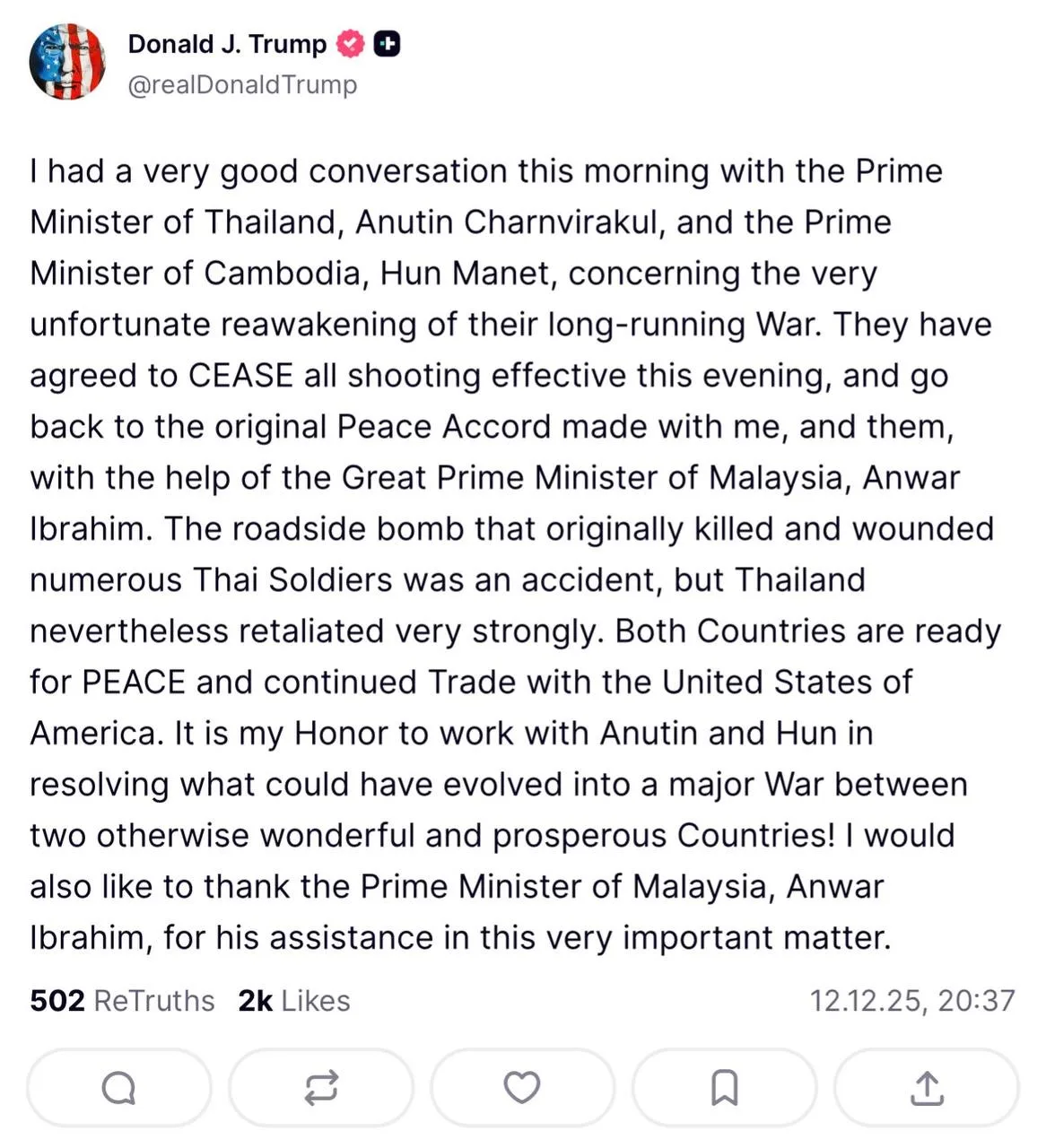 «Сегодня утром у меня состоялся очень хороший разговор с премьер-министром Таиланда Анутином Чарнвиракулом и премьер-министром Камбоджи Хун Манетом по поводу очень печального возобновления их давнего конфликта. Они согласились прекратить все боевые действия с сегодняшнего вечера и вернуться к первоначальному мирному соглашению, заключенному со мной и с ними при содействии великого премьер-министра Малайзии Анвара Ибрагима», — написал глава Белого дома в Truth Social.