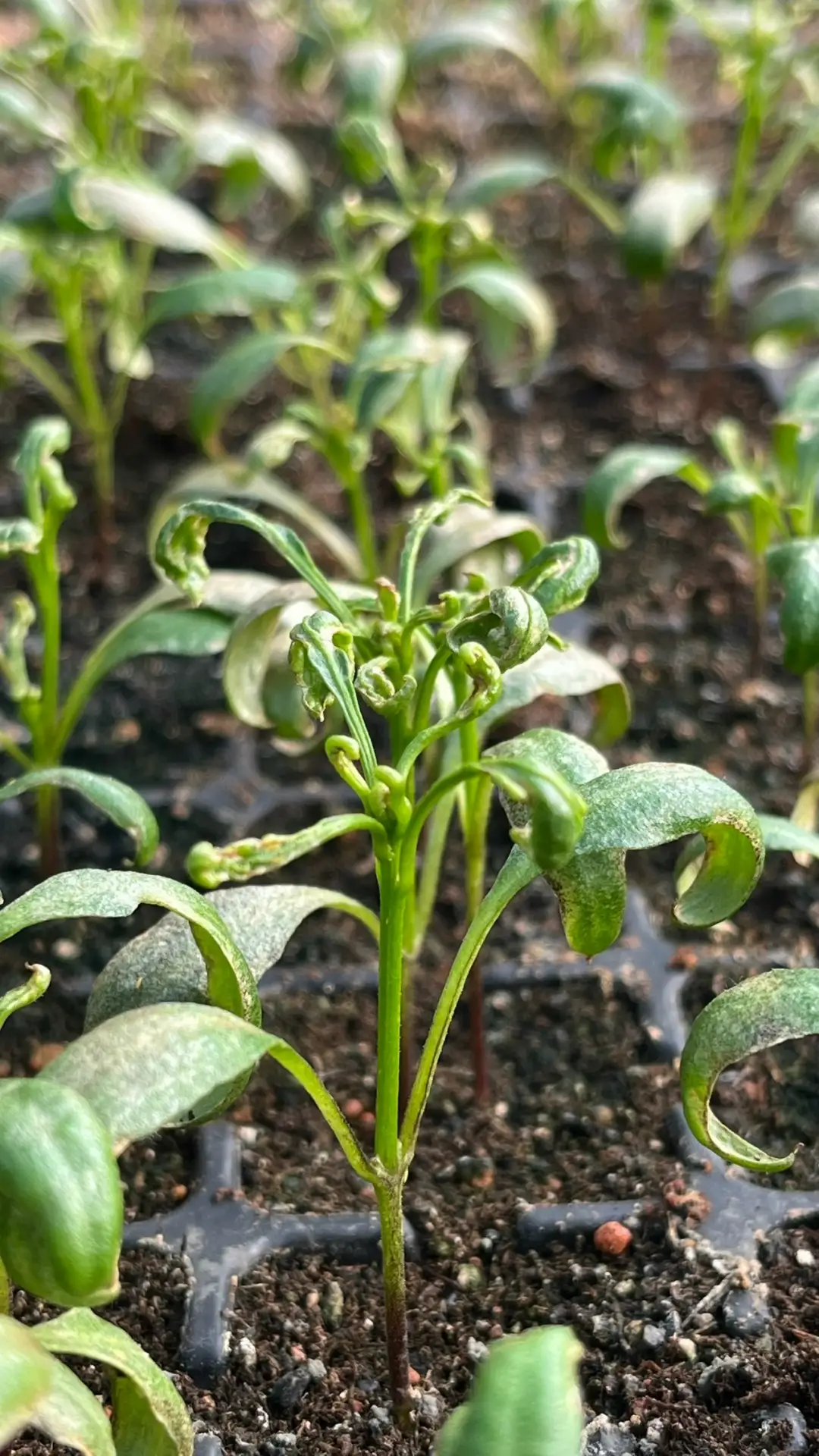 Опытами мне особо некогда заниматься, но иногда прям "выстреливает". Перец посеян сухими семенами по 2-3 семечки в кассету 23 января 2026 года, сорта разные - пробовал на всхожесть семена с прошлого года чтобы сеять в текущем году. Полные всходы на 1 февраля. На сегодняшний день перцы выглядят так! Корни нормальные, белые, без повреждений, лист в оэдемную точку, крутится, точка роста деформирована и не развивается. Что случилось?