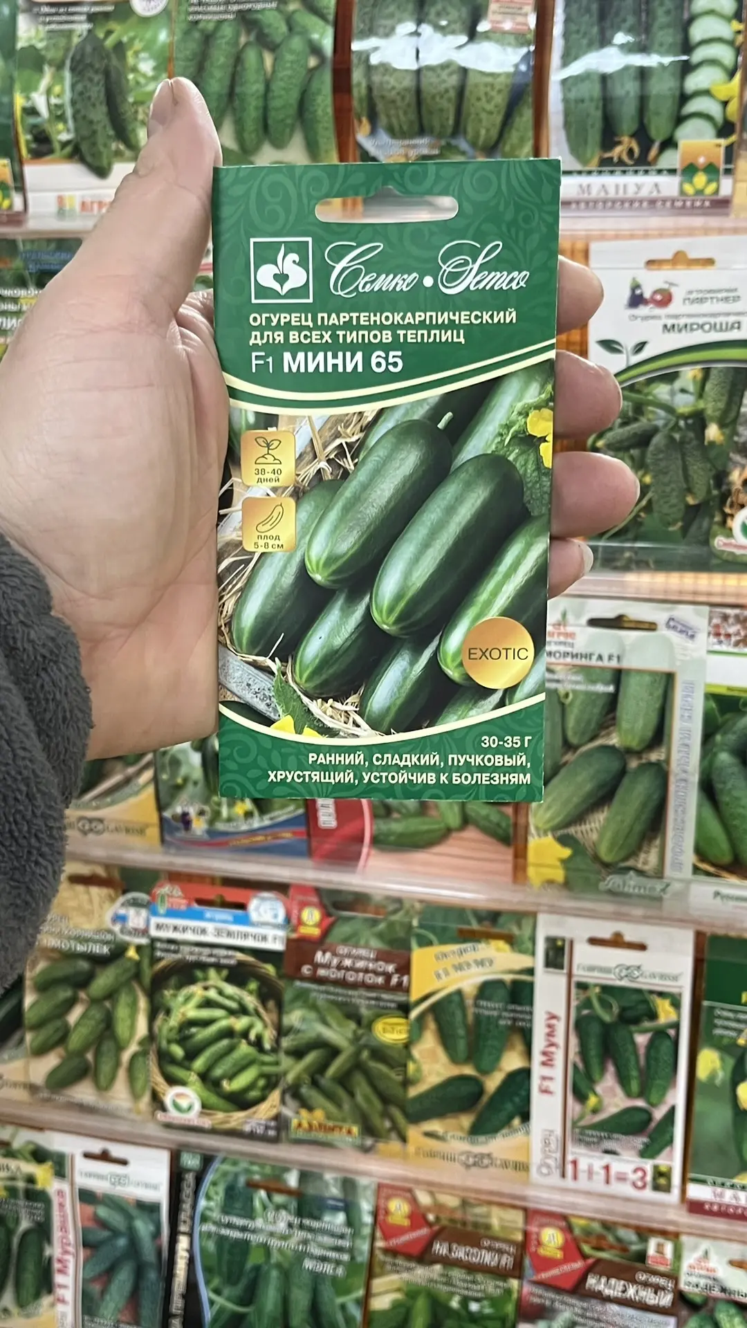 4. Мини 65 – потрясающий вкус и консистенция. Кожа тонкая, огурец «огуречного» вкуса, очень сочный и гармоничный. Лучше в теплицу и формировать в один стебель. Некие десертные огурцы, совершенно непривычные. Самые вкусные в середины стадии расширения.
