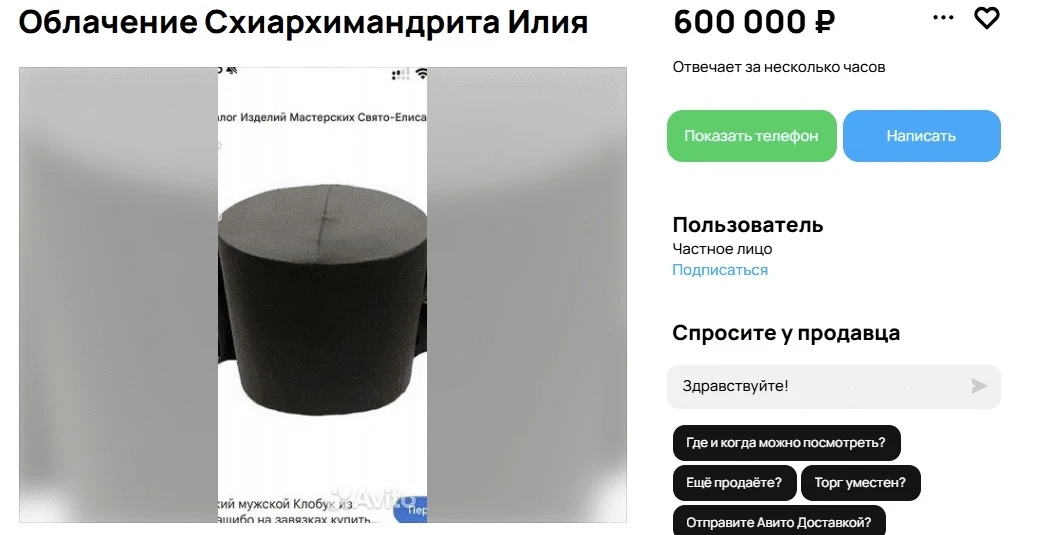 Читатели соцсетей предполагают, что продаёт вещь кто-то из помощников или приближённых старца. Судя по объявлению, клобук — не первое облачение, которое таким образом оказалось на рынке.