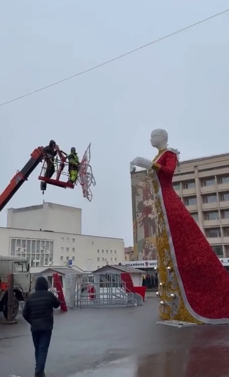 В Орле на площади Ленина продолжаются работы по монтажу нового арт-объекта – фигуры Снегурочки. В процессе установки возникла проблема с примеркой головного убора.