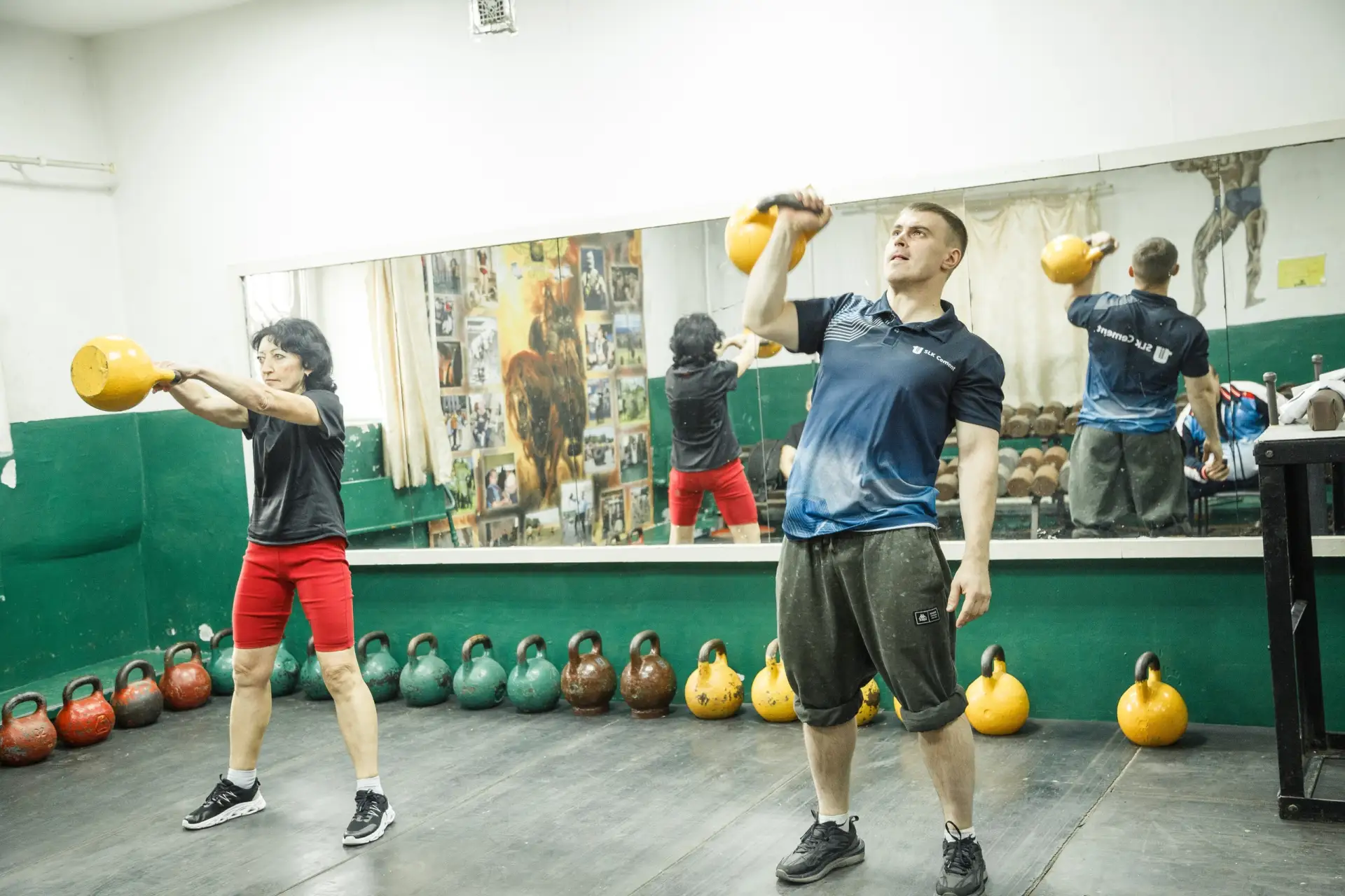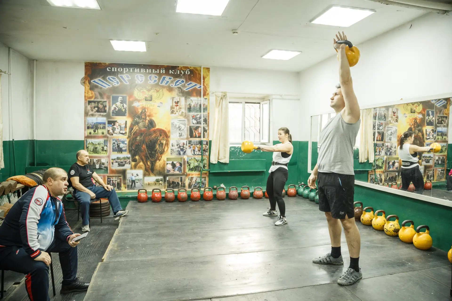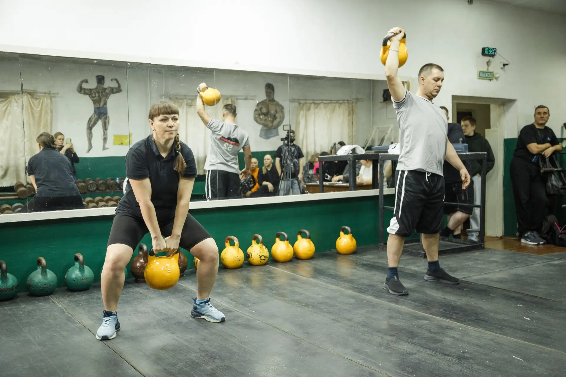 Для зрелищности соревнования в гиревом спорте проводились в паре: женщина из одной команды выполняла мах гирей (свинг), мужчина из другой команды – жим гири. В течение пяти минут им нужно было выполнить наибольшее количество упражнений. Нередко в лидерах оказывались представительницы слабого (а по факту совсем не слабого!) пола.