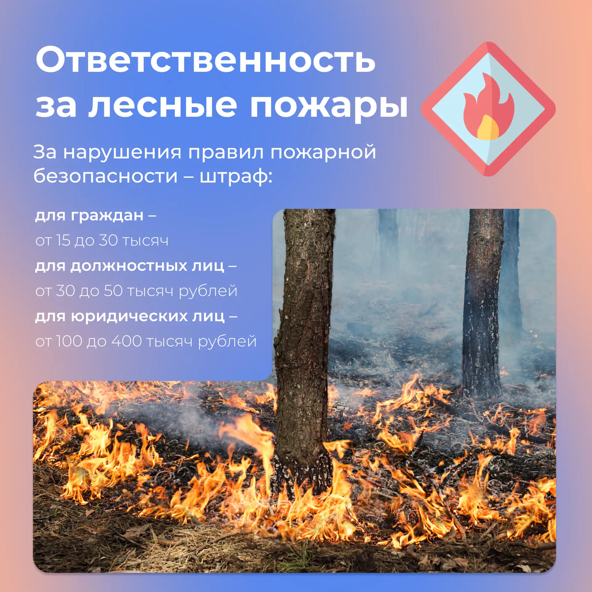 За несоблюдение пожарной безопасности, которое повлекло за собой возгорание в лесном фонде, штрафуют до двух миллионов рублей. Кроме того, виновников обязуют возместить вред