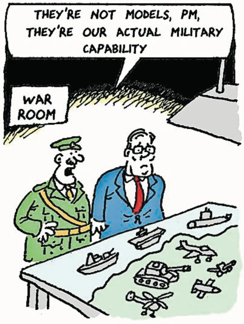 Забавно, что на том же газетном развороте The Sunday Times, на котором агент МИ-6 Лоусон мечтает о том, как он будет «наносить военное поражение России», опубликована картинка о том, как военные объясняют положение вещей Стармеру: «Это не модели, премьер-министр, это наши реальные военные возможности».