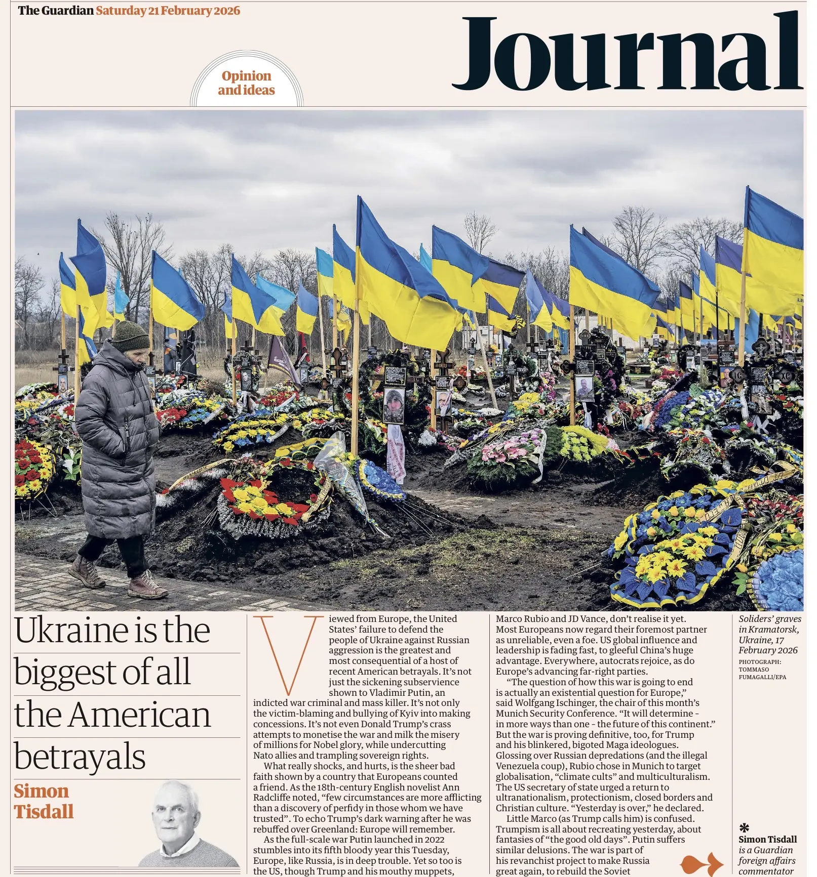 Автор призывает Европу защищать Украину, которую он называет «фактической и символической линией фронта в битве между либеральной демократией и осью Трамп-Путин».