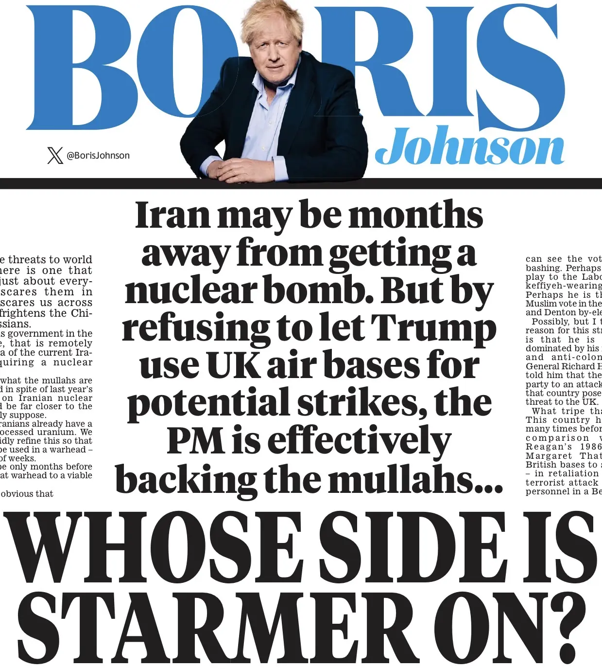Бориска Джонсон сегодня со страниц Daily Mail обличает Стармера в том, что тот якобы поддерживает тегеранский режим, отказываясь предоставлять Трампу британские базы для ударов по Ирану. Лохматый лицемер поясняет: