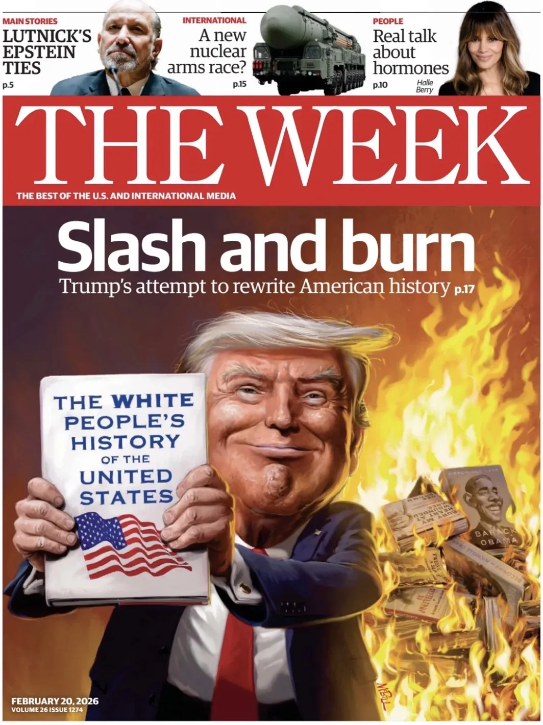 Американский еженедельник The Week обвиняет Трампа в «переписывании американской истории». Критикуется его исполнительный указ «Восстановление правды и здравого смысла в американской истории», который журнал пытается представить как «гимн ревизионизму, основанному на превосходстве белой расы». Соответственно, на обложке Трамп держит книгу «История белых людей Соединенных Штатов».