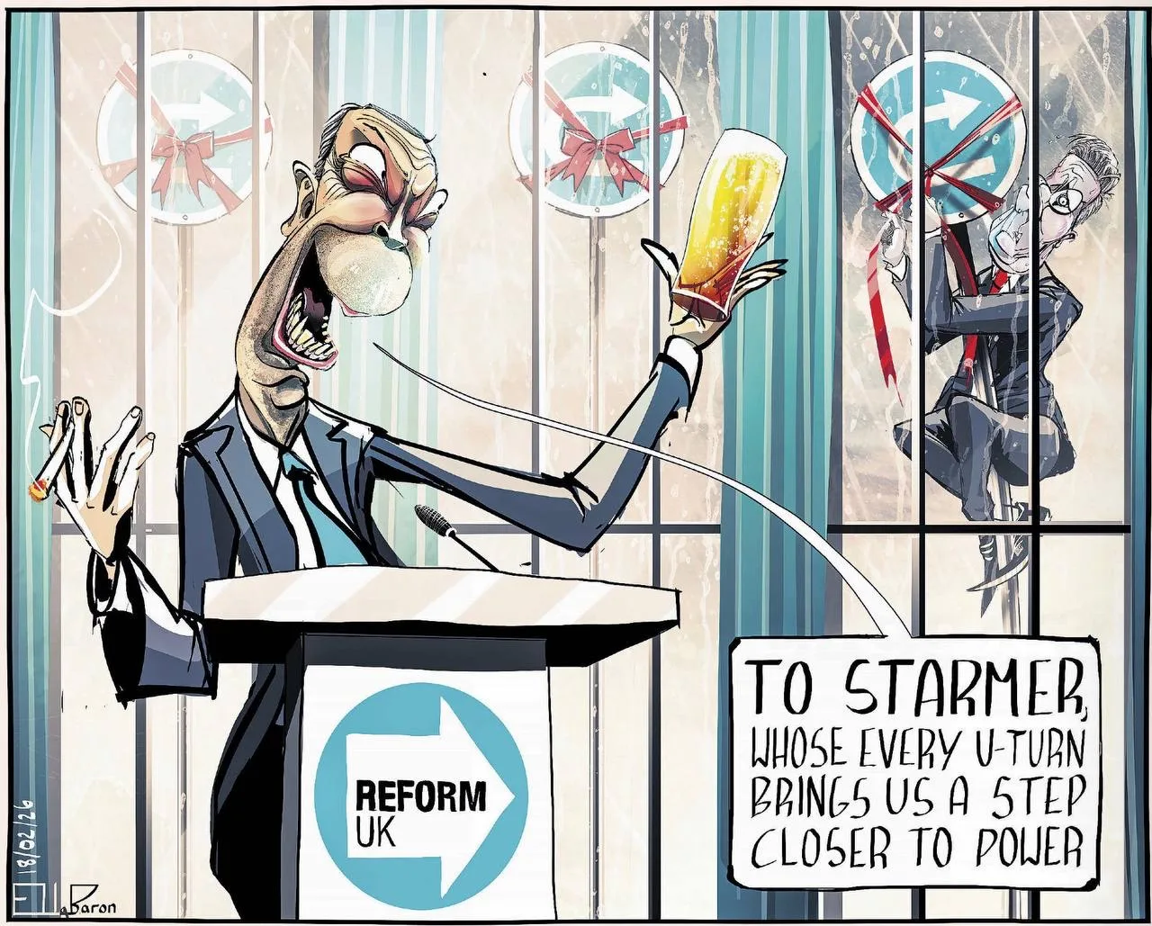Комментируя очередной (уже который по счету!) разворот правительства Стармера в своей политике социального обеспечения, газета рисует ликующего Найджела Фараджа: «За Стармера, каждый разворот которого делает нас на шаг ближе к победе».
