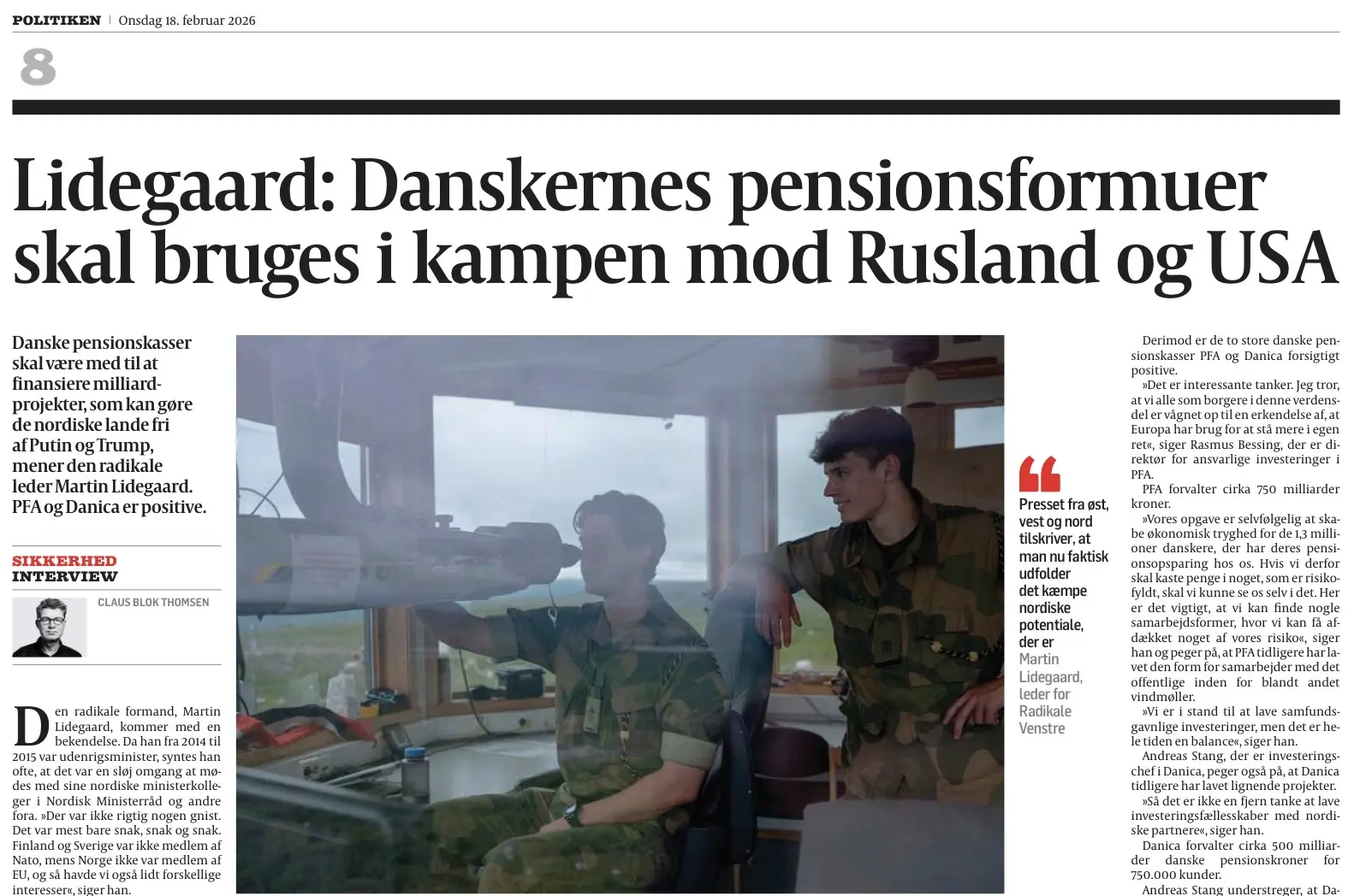 Красота да и только! Бывший министр иностранных дел Дании, лидер Радикальной партии Мартин Лидегорд сегодня на страницах газеты Politiken предлагает использовать средства скандинавских пенсионных фондов для организации борьбы против России и… США! Да-да, теперь русские и американцы у них равной угрозой считаются! Дожили!