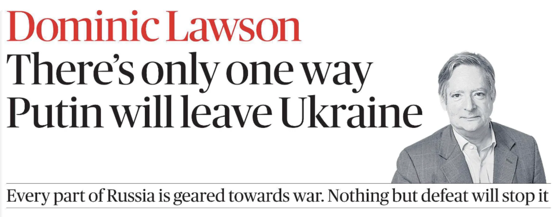 Колумнист The Sunday Times Доминик Лоусон (которого обоснованно подозревают в работе на МИ-6) сегодня доказывает, что есть «единственный способ заставить Путина покинуть Украину» - нанести военное поражение России.