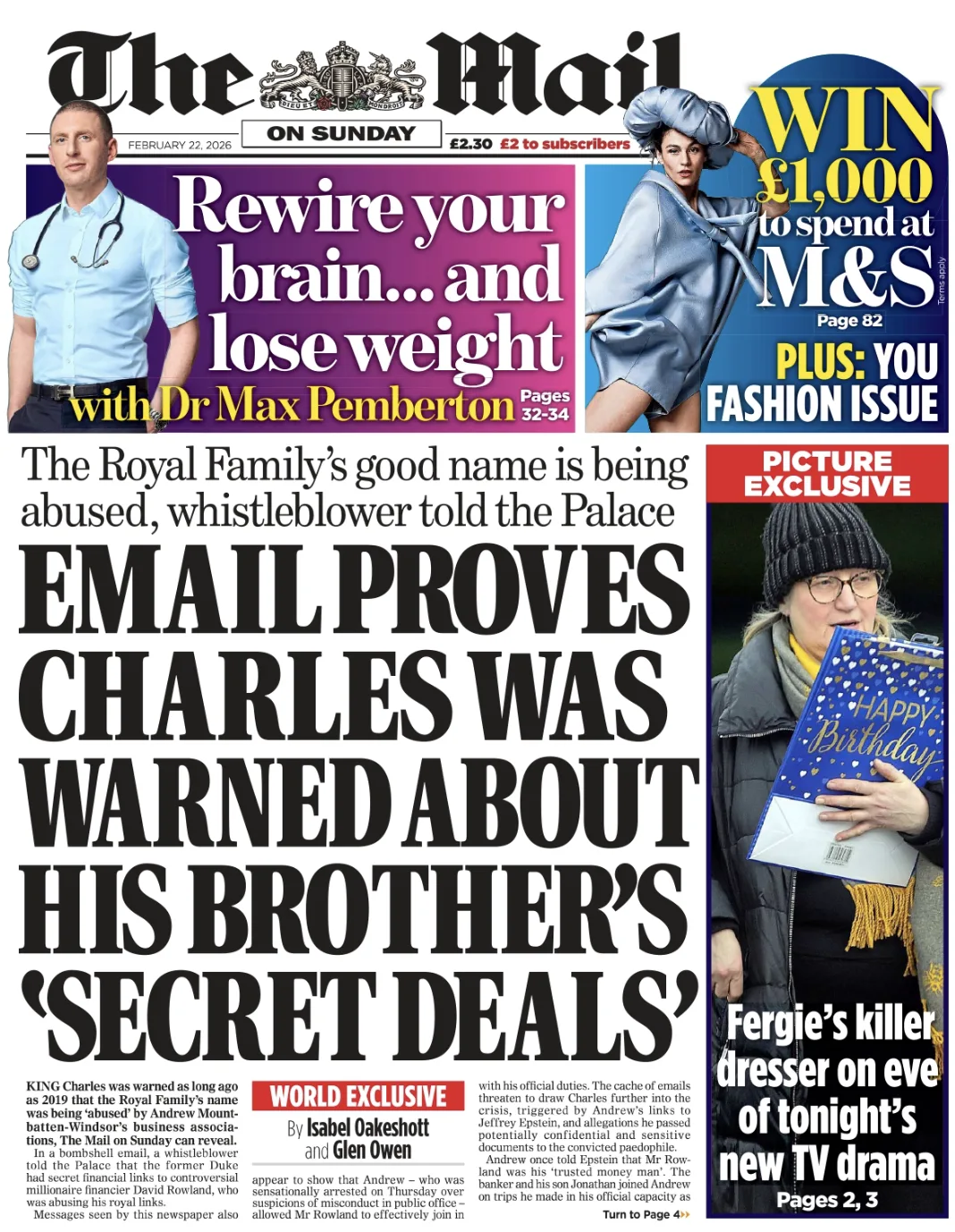 Газета The Mail on Sunday (заметьте, крайне роялистская!) публикует сегодня электронные письма, доказывающие, что британский королёк Чарльз прекрасно знал о темных бизнес-делишках своего братца-извращенца Эндрю.