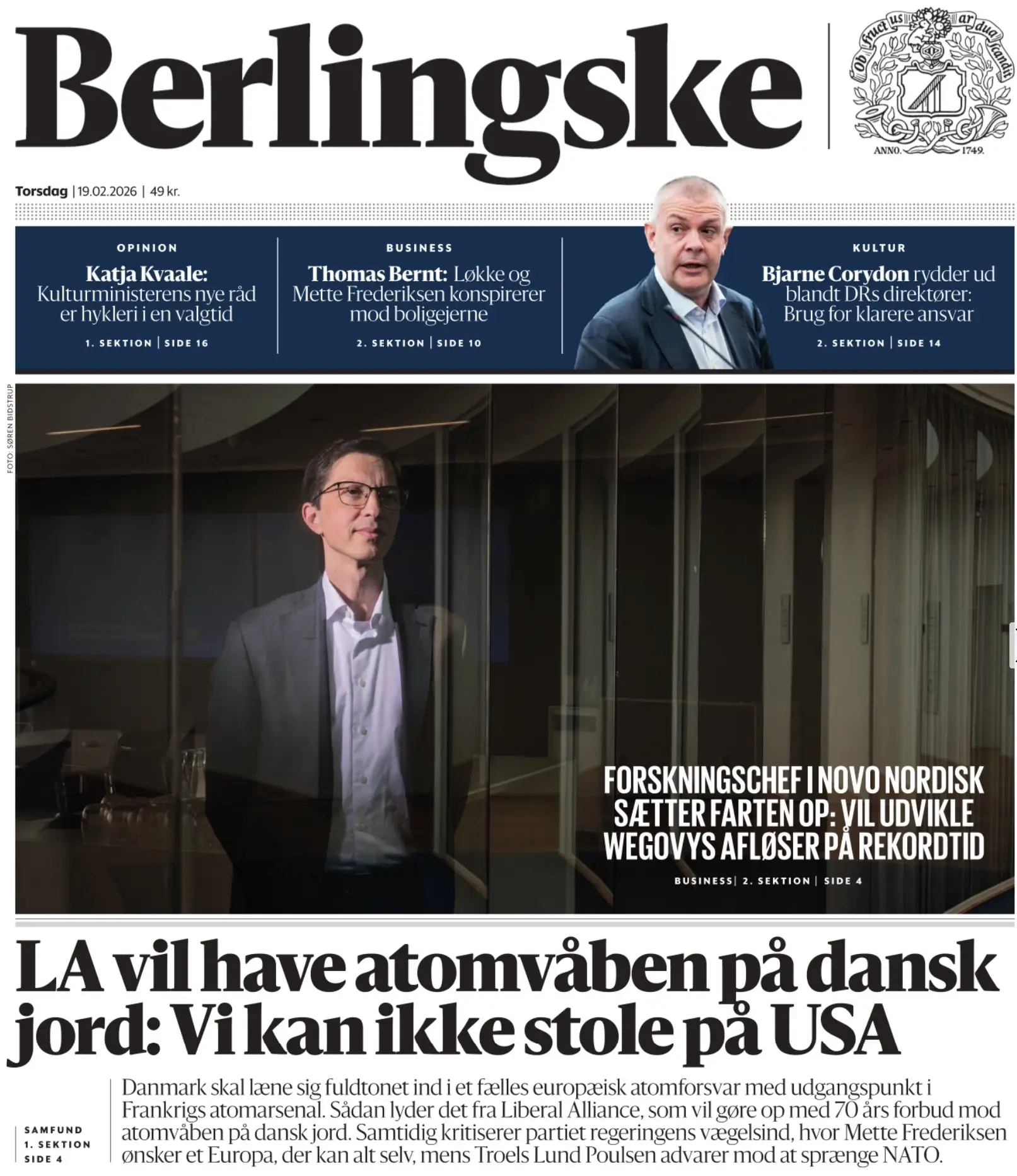Главная новость сегодня в Дании: газета Berlingske сообщает, что партия Либеральный альянс требует отказаться от моратория на размещение ядерного оружия в стране, которе действует 70 лет. И призывает разместить там ядерные ракеты.