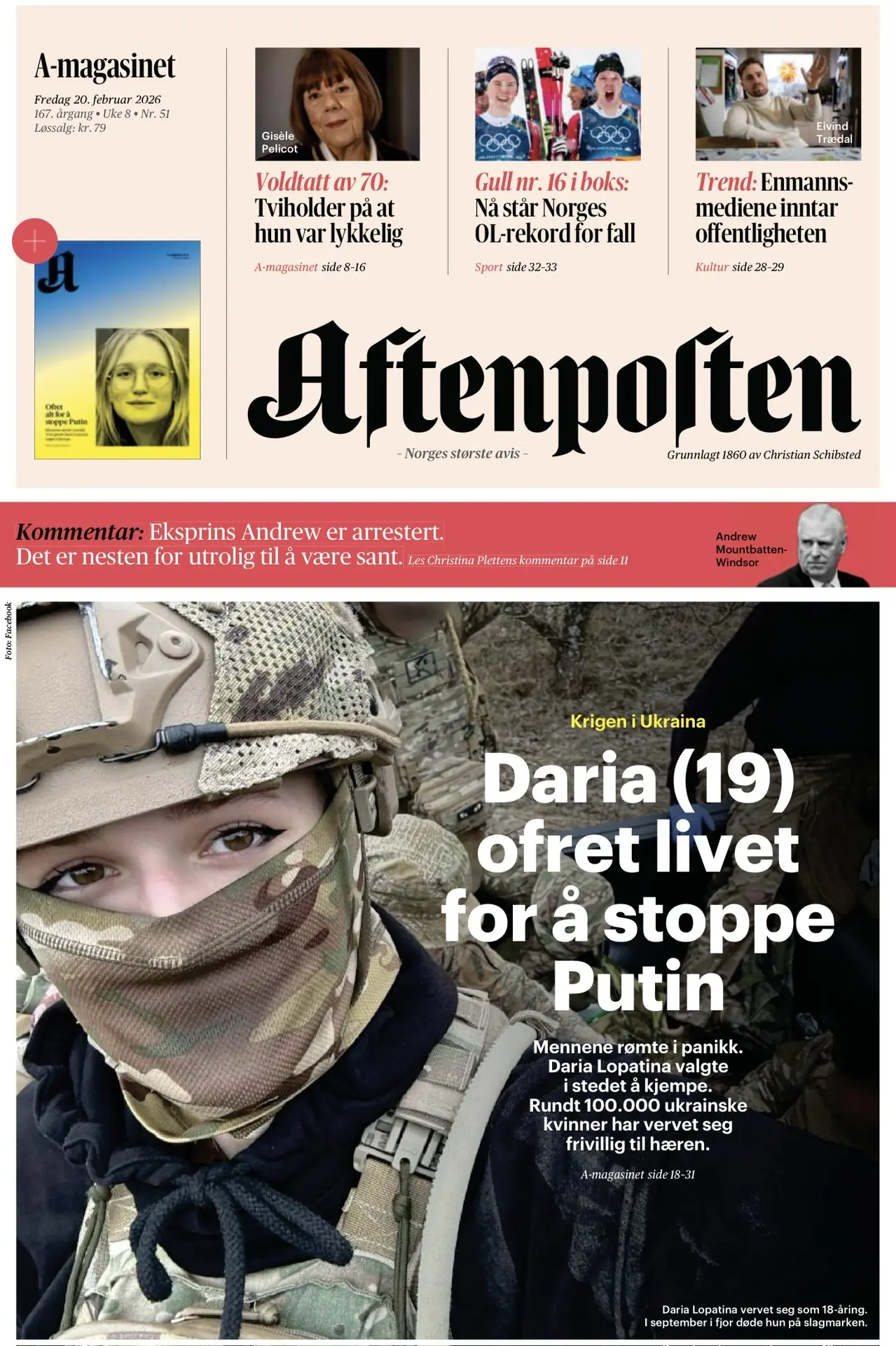 Главный материал сегодняшнего выпуска норвежской газеты Aftenposten посвящен женщинам, которые служат в ВСУ. Заголовок очень пафосный: «19-летняя Дарья пожертвовала жизнью, чтобы остановить Путина». И вдумайтесь, целых 13 страниц газеты (с 18 по 31 полосы) рассказывают о гибели Дарьи Лопатиной в прошлом году под Торецком!