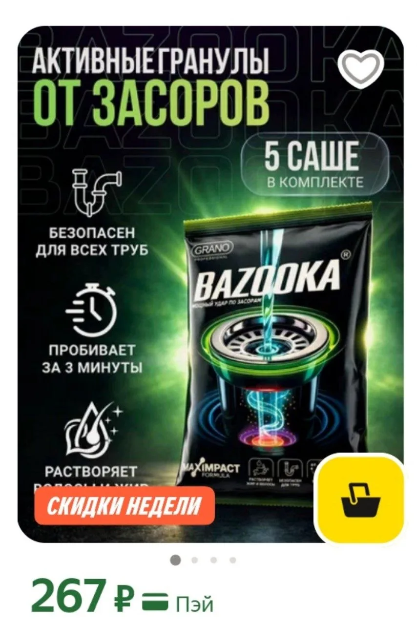 Средство от засоров труб BAZOOKA (базука) 60 г, 5 шт, гранулы