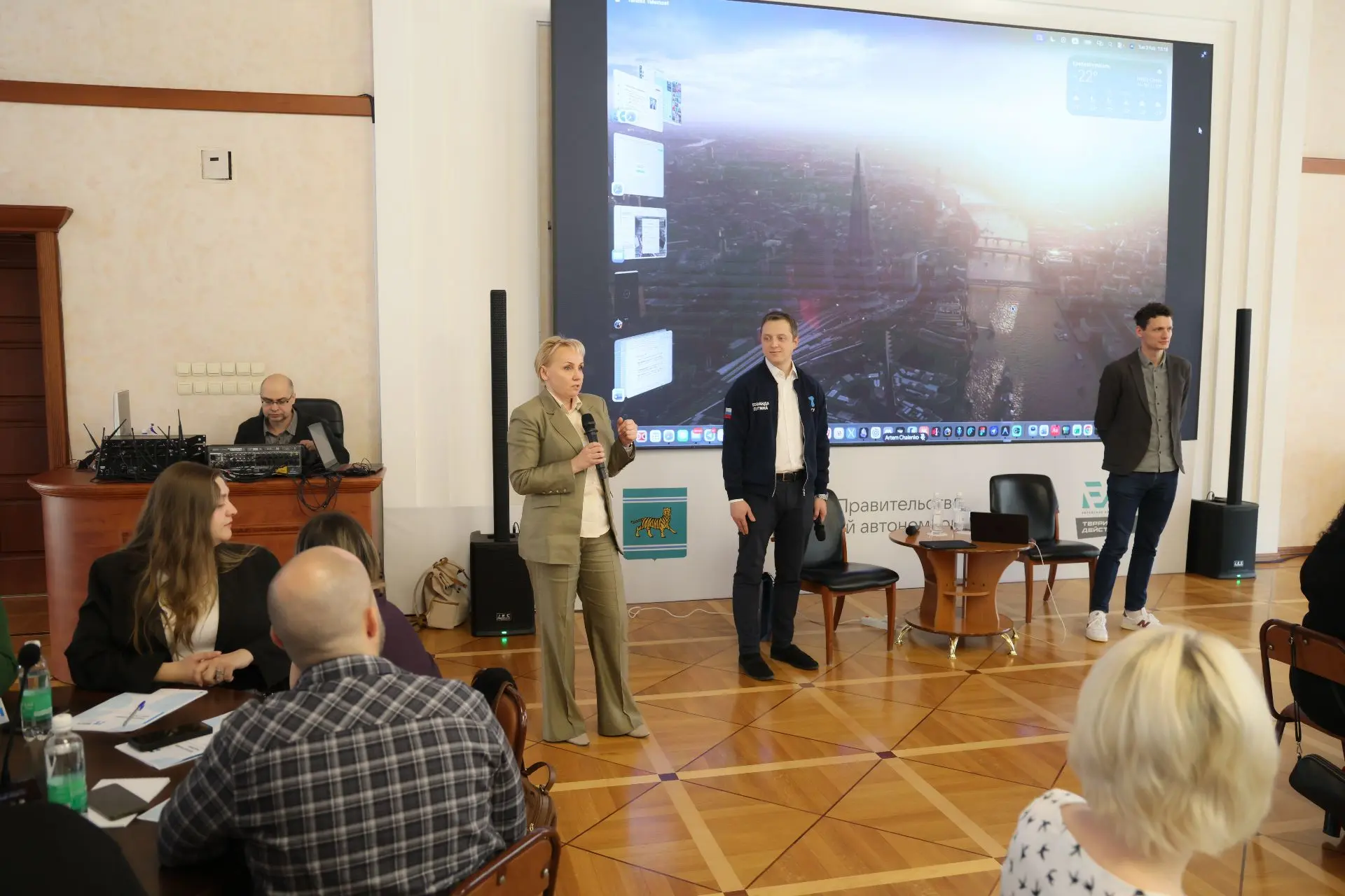 Обсудили, как сделать Биробиджан более удобным для жителей и привлекательным для гостей, на встрече с руководителем благотворительного фонда «Территория комфорта» Александром Романовым, мэром города Алексеем Кузьминым и депутатом городской Думы Кириллом Девятко. Фонд — это объединение предпринимателей и общественных деятелей, которые вместе с мэрией Биробиджана занимаются благоустройством города.