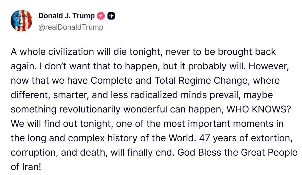 "Я согласен приостановить бомбардировки и атаки на Иран на период двух недель. Это будет двустороннее прекращение огня".