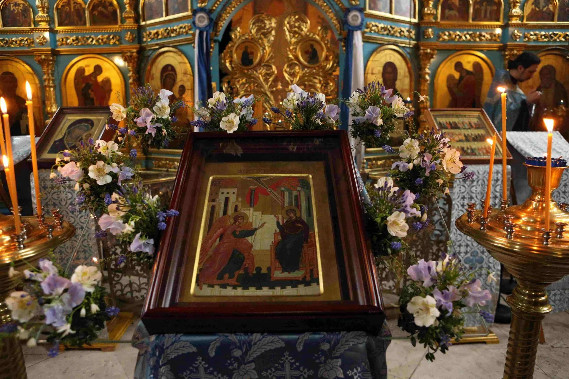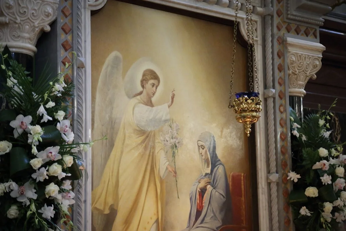«Днесь спасения нашего главизна и еже от века таинства явление: Сын Божий Сын Девы бывает, и Гавриил благодать благовествует. Темже и мы с ним Богородице возопиим: радуйся, Благодатная, Господь с Тобою».