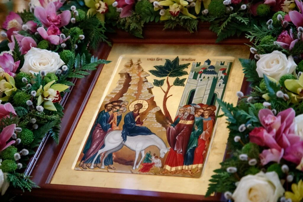 На престоле восседая на небесах, шествуя по земле на осленке, Христе Боже, принял Ты хвалу от Ангелов и прославление от детей, восклицавших Тебе: «Благословен Ты, Идущий призвать к Себе Адама!»