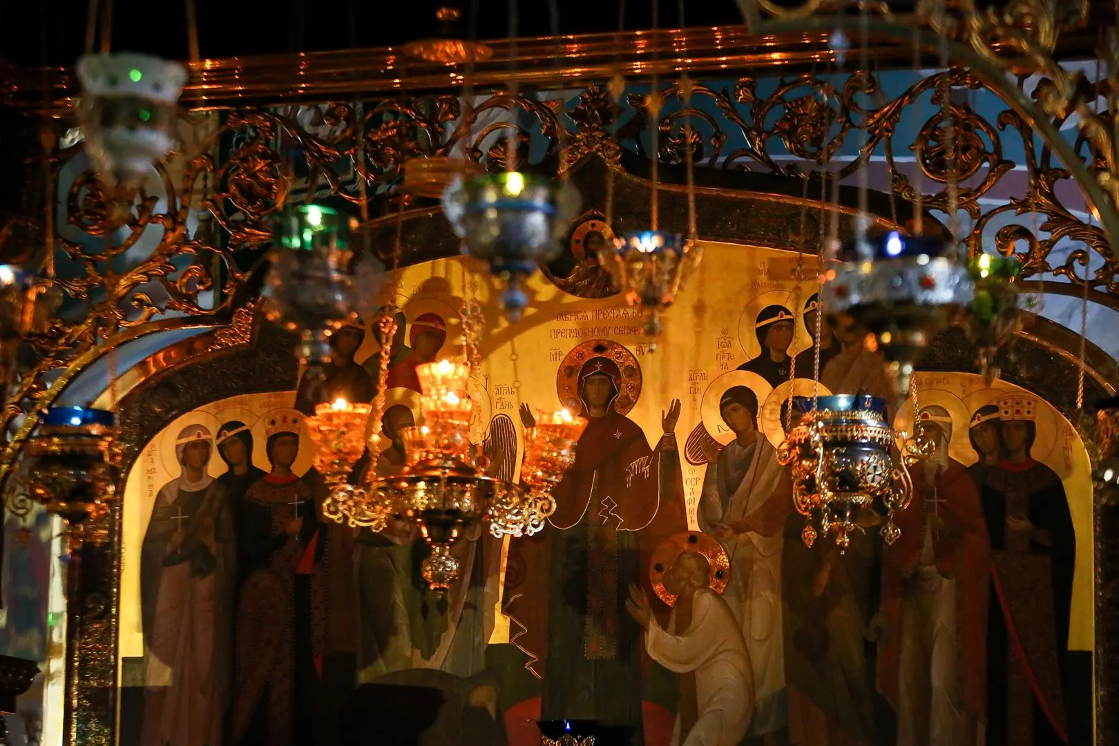 Се Жени́х гряде́т в полу́нощи,/ и блаже́н раб, Его́же обря́щет бдя́ща,/ недосто́ин же па́ки, Его́же обря́щет уныва́юща./ Блюди́ у́бо, душе́ моя́,/ не сно́м отяготи́ся,/ да не сме́рти пре́дана бу́деши,/ и Ца́рствия вне затвори́шися,/ но воспряни́ зову́щи:/ Свят, Свят, Свят еси́, Бо́же,// Богоро́дицею поми́луй нас.