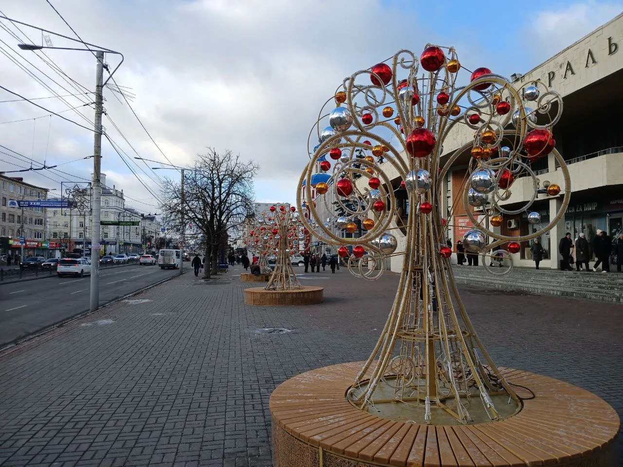 В субботу, 13 декабря, новогодние деревья с шарами установили на тротуаре возле кинотеатра «Центральный».
