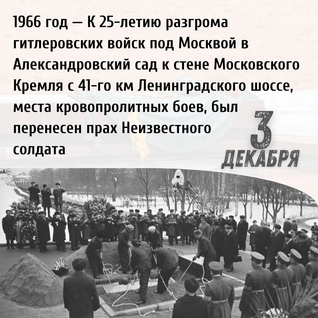 3 декабря 1966 года в ознаменование 25-летия разгрома гитлеровских войск под Москвой прах Неизвестного солдата был перенесён из братской могилы на 41-м километре Ленинградского шоссе и торжественно захоронен в Александровском саду у Кремлёвской стены. 8 мая 1967 г. здесь был открыт мемориальный памятник – могила Неизвестного солдата.