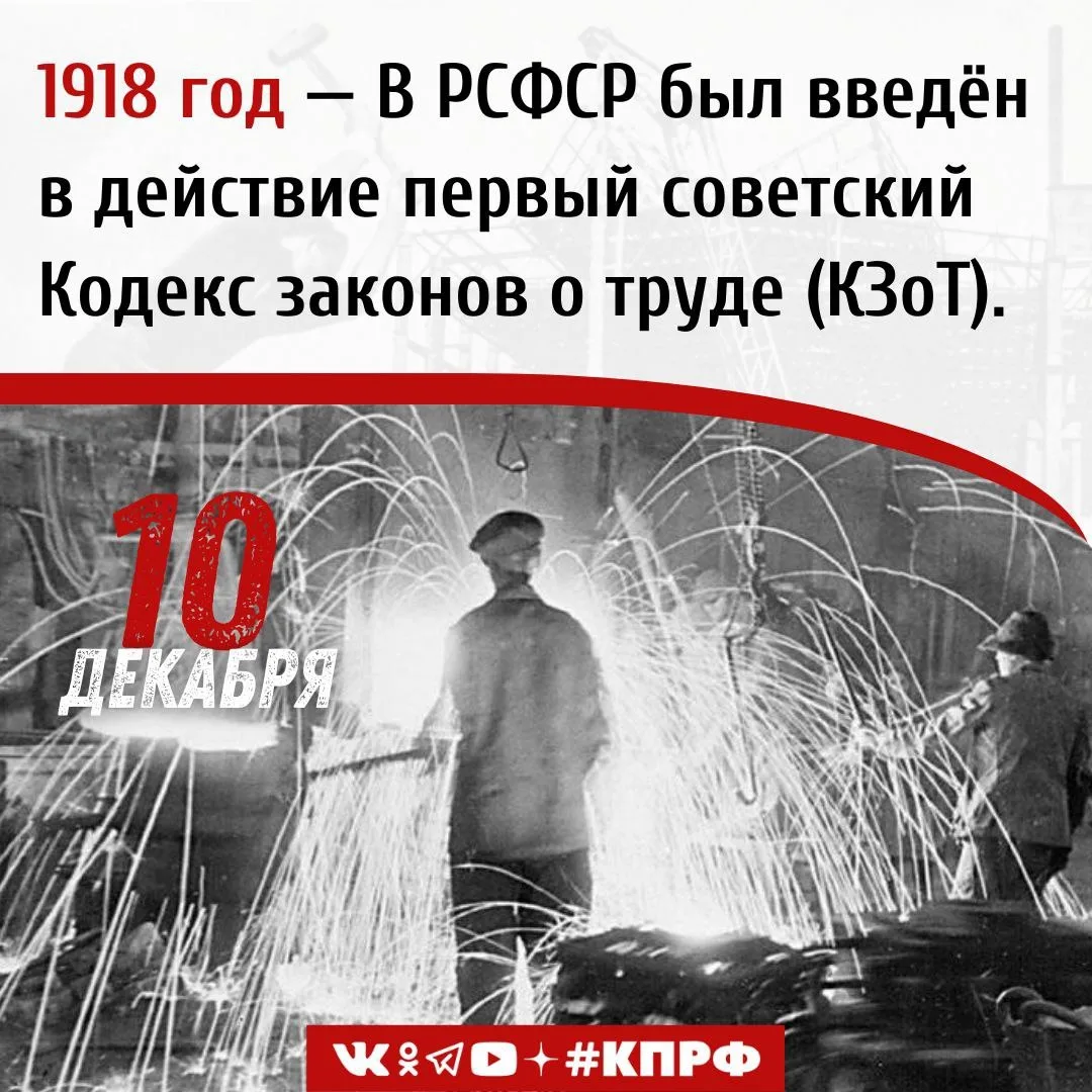 10 декабря 1918 года – В РСФСР был введён в действие первый советский Кодекс законов о труде (КЗоТ).