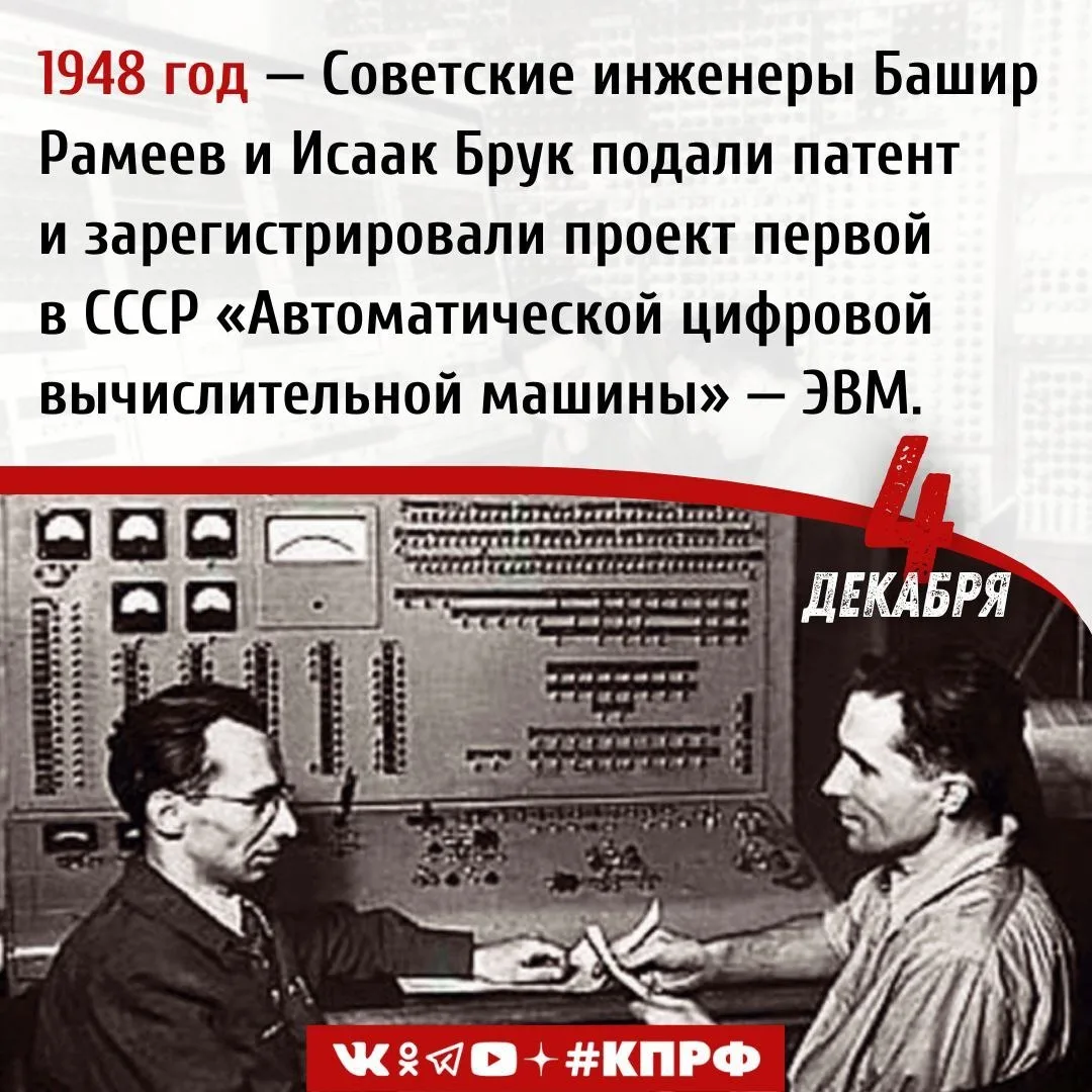 4 декабря 1948 года советские инженеры Башир Рамеев и Исаак Брук подали патент и зарегистрировали проект первой в СССР «Автоматической цифровой вычислительной машины» — ЭВМ.