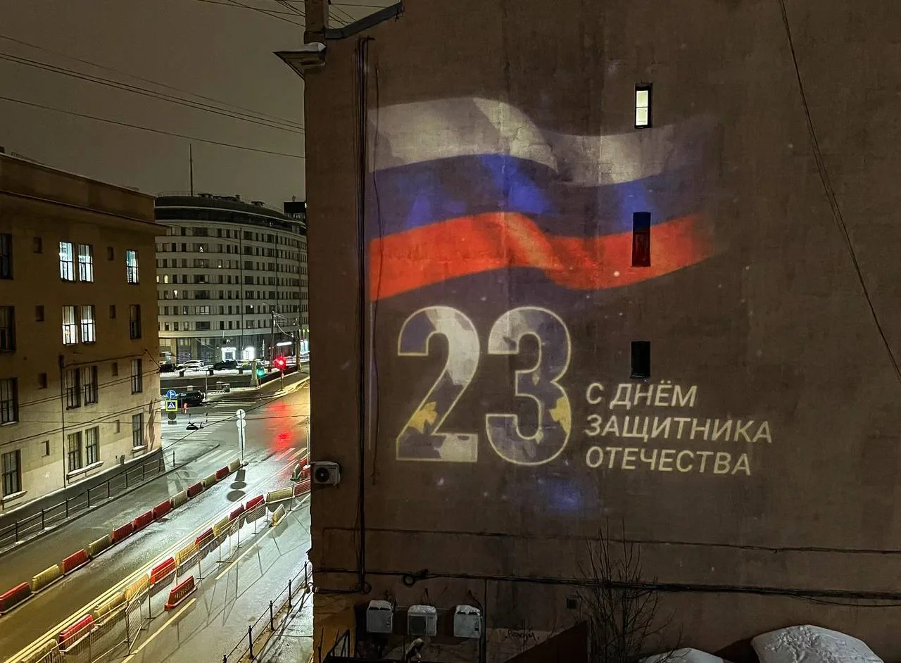 В честь Дня защитника Отечества фасады некоторых зданий в Петербурге украсят световые проекции. На фасадах девяти городских зданий разместят световые проекции с изображениями национального флага и патриотической символики.