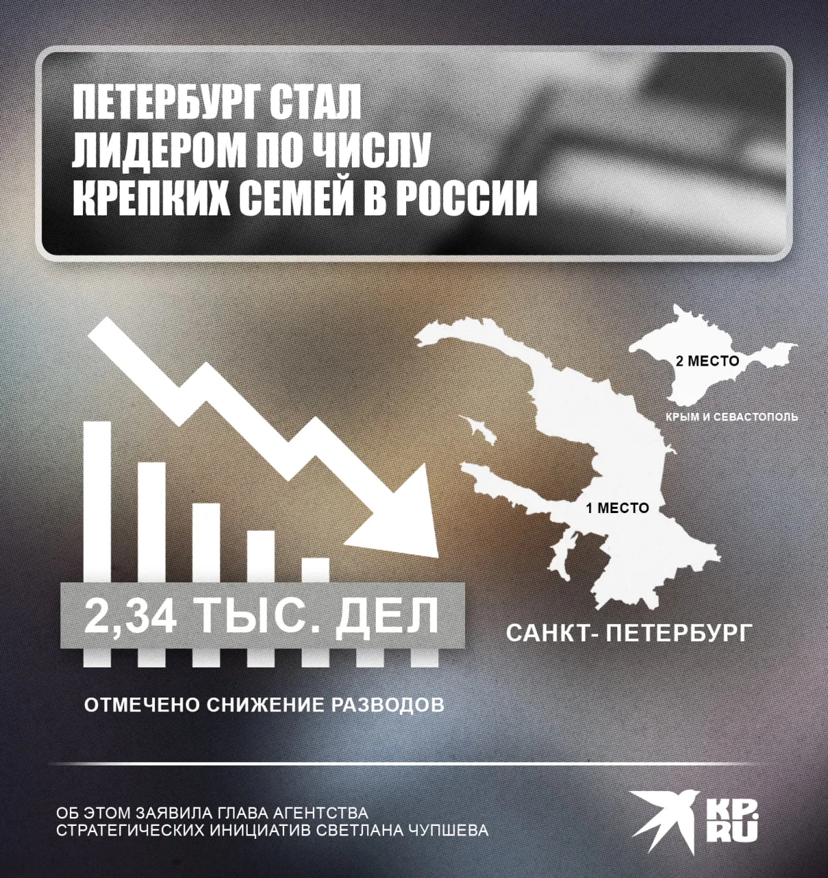 Петербург занял первое место в стране по минимальному количеству разводов относительно числа браков — тенденция сохраняется третий год подряд. В лидерах также оказались Крым и Севастополь.