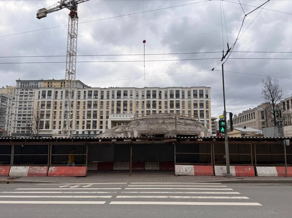 На площадке будущего выхода станции уже установили первые колонны первого этажа: старый вестибюль демонтировали, сохранив лишь исторический бронекупол, который впишут в новое семиэтажное здание.