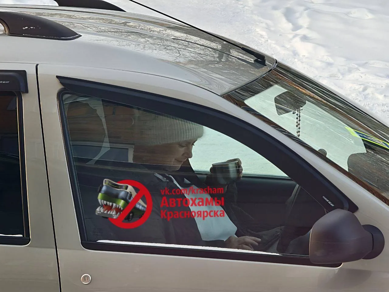 Дама пьет чаек за рулем и улыбается. Дама довольна собой — она встала посреди пешеходного перехода, и игнорирует замечания прохожих, рискующих попасть под колеса других авто.