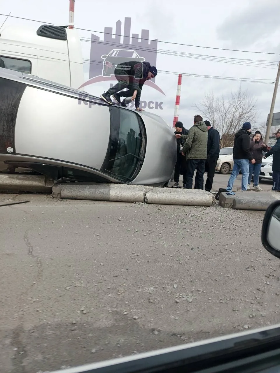 Северо-Енисейская. Водитель грузовичка пытался научить другого водителя правильно ездить по нашим дорогам, но в итоге сам стал виновником аварии.