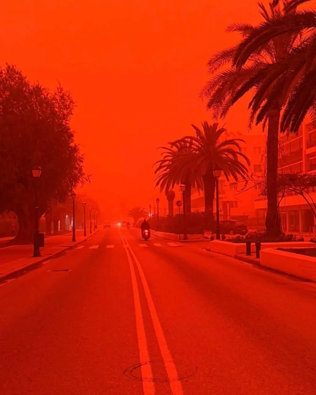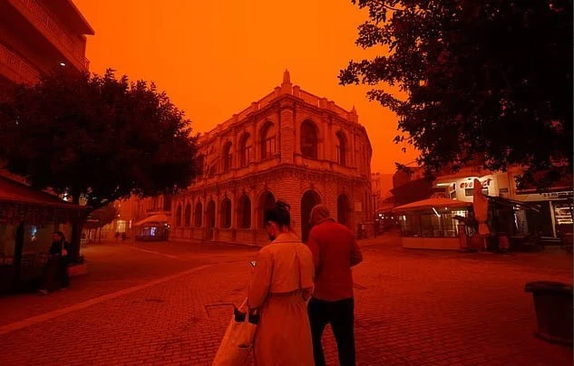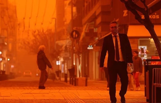 Греческий остров Крит стал кроваво-красным из-за песчаной бури. Массы песка накрыли остров и теперь власти призывают граждан прятаться в помещениях.