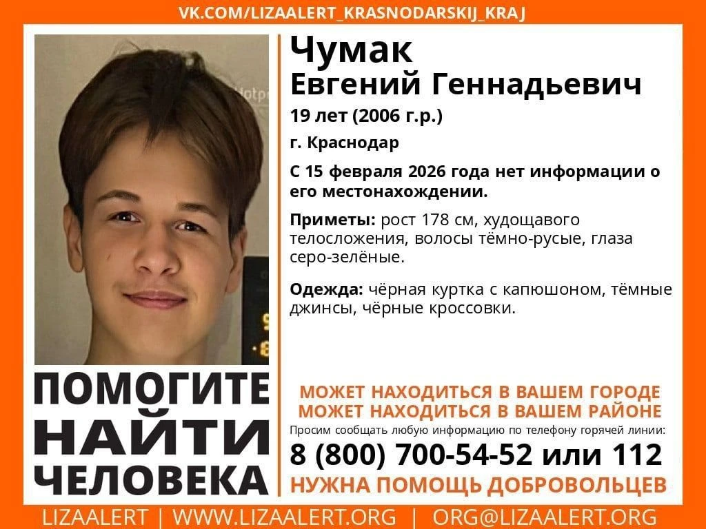 В Краснодаре пропал подросток Чумак Евгений Геннадьевич, 19 лет (2006 г.р.)