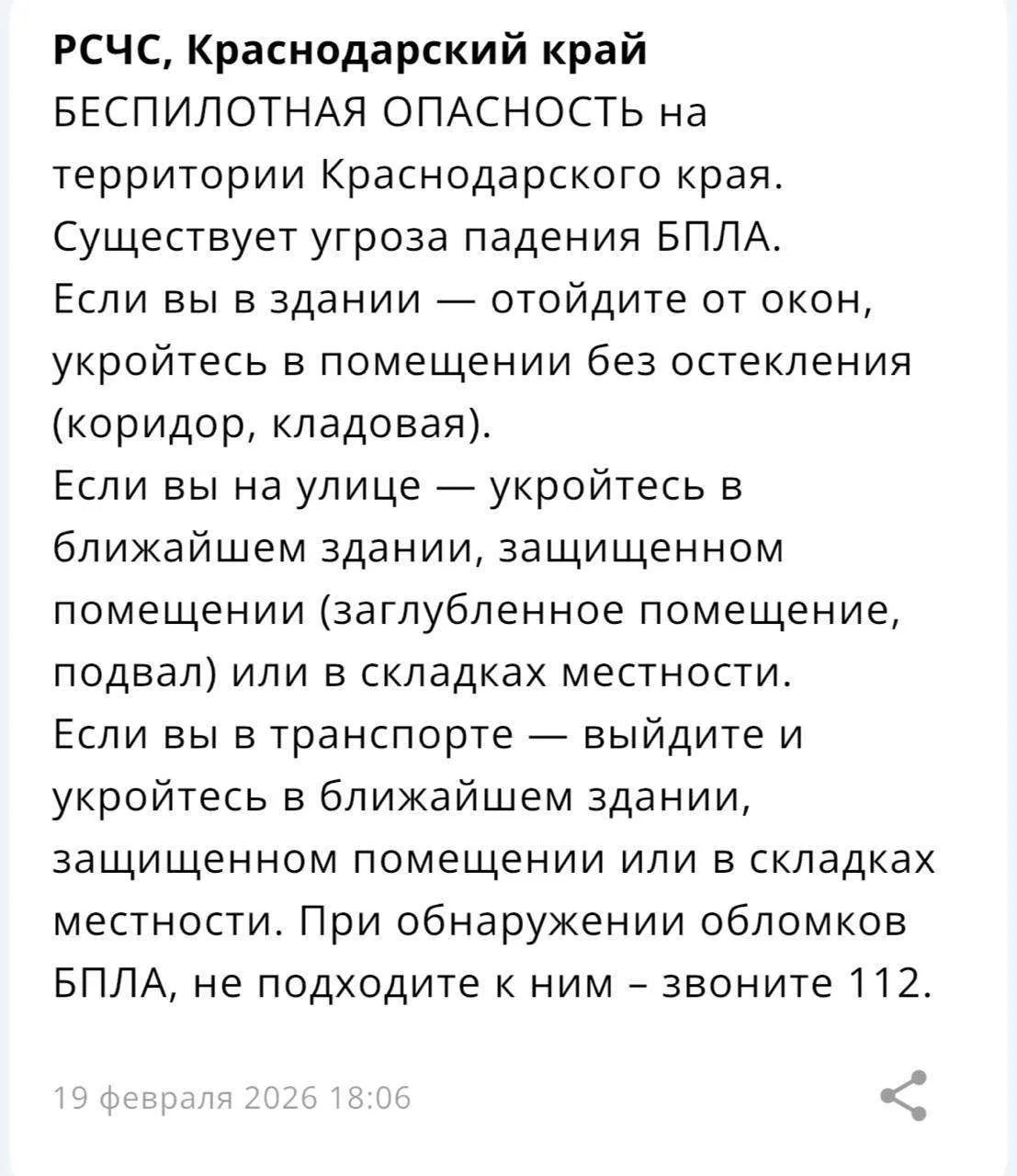 ⚠️ На территории Краснодарского края объявлена отмена угрозы «Ракетная опасность»