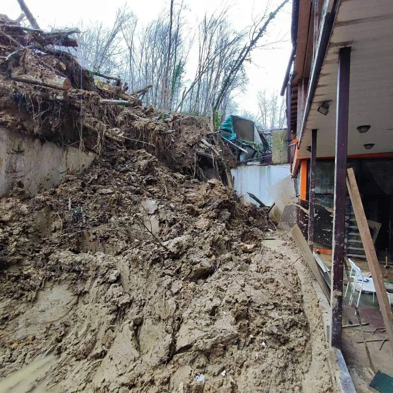 Прилегающая территория по-прежнему завалена стволами деревьев и тоннами глины, которая продолжает сползать к жилым стенам.