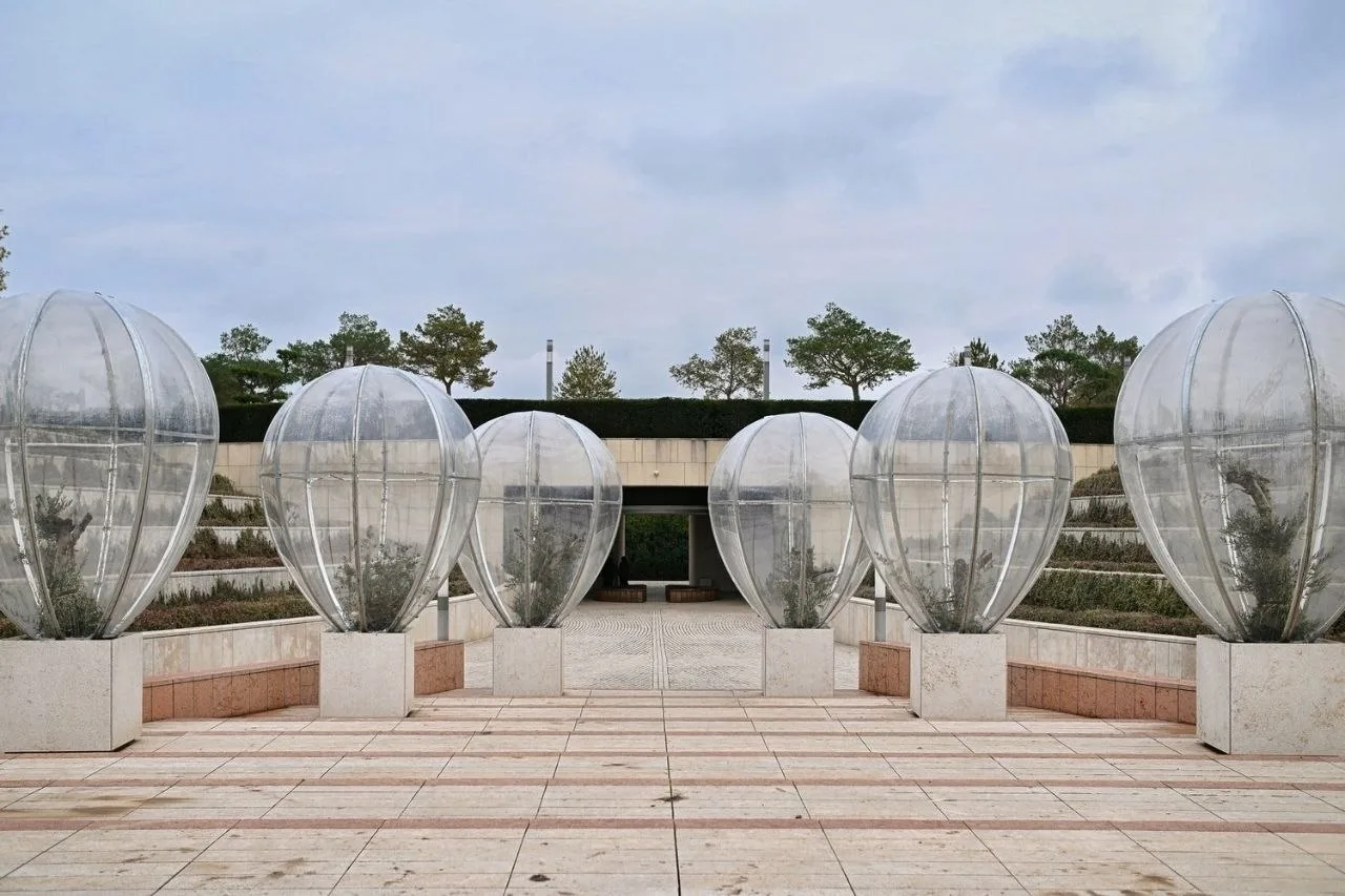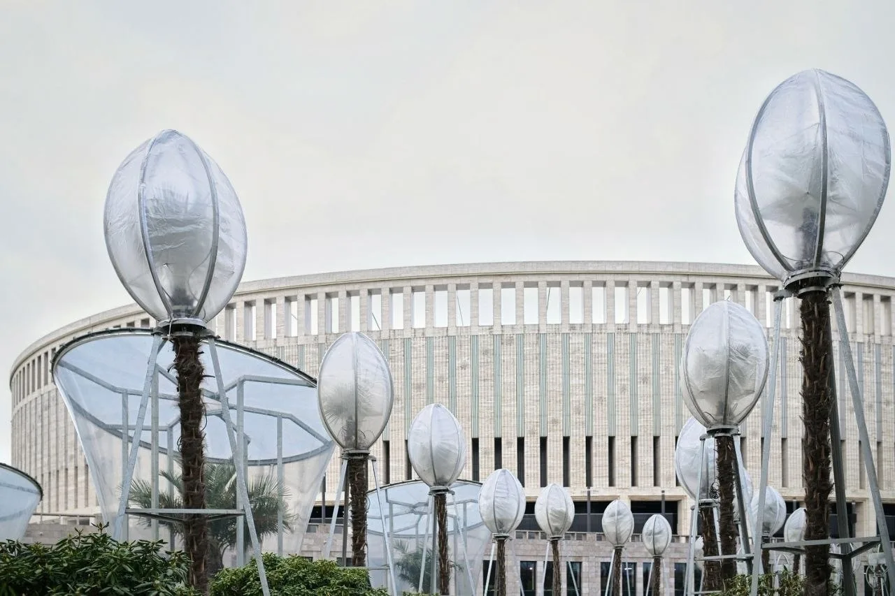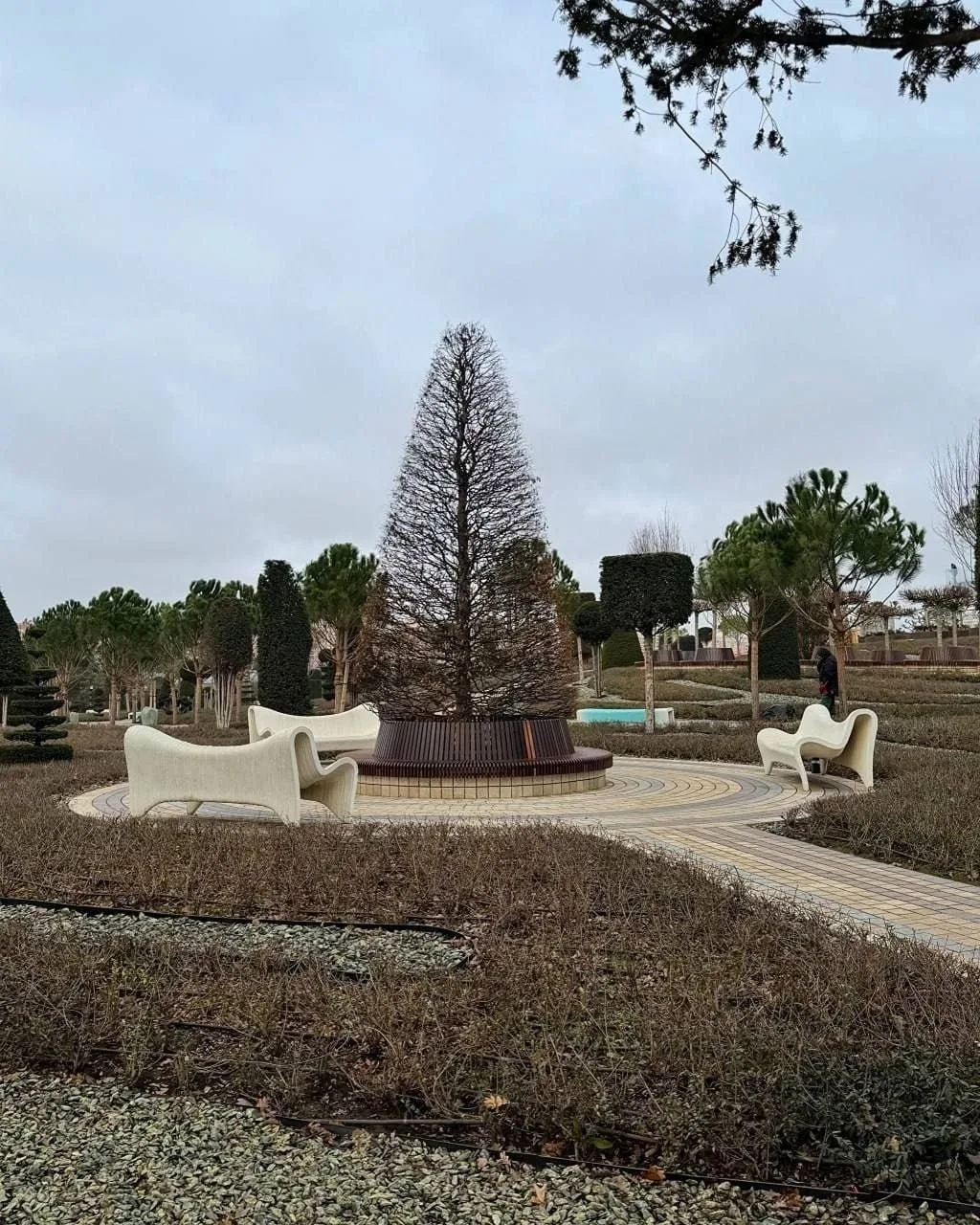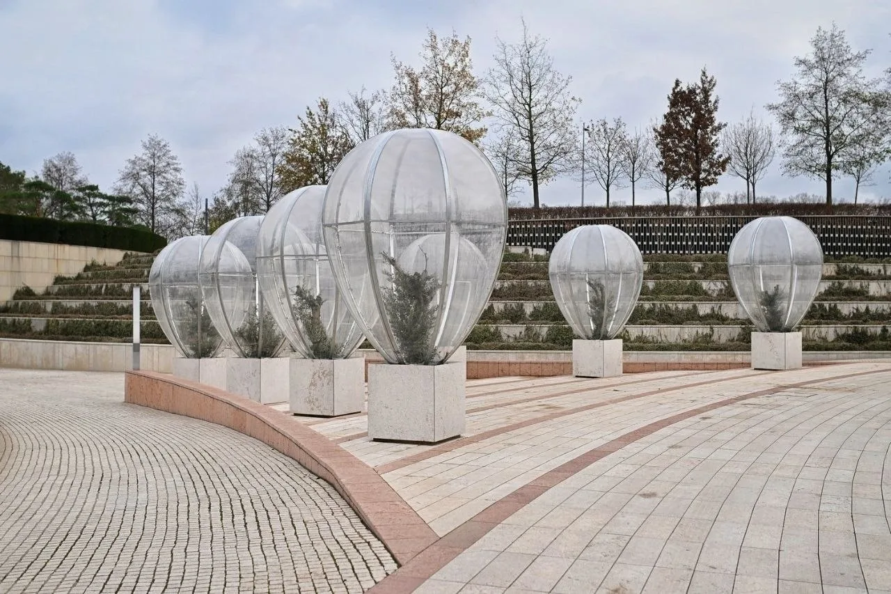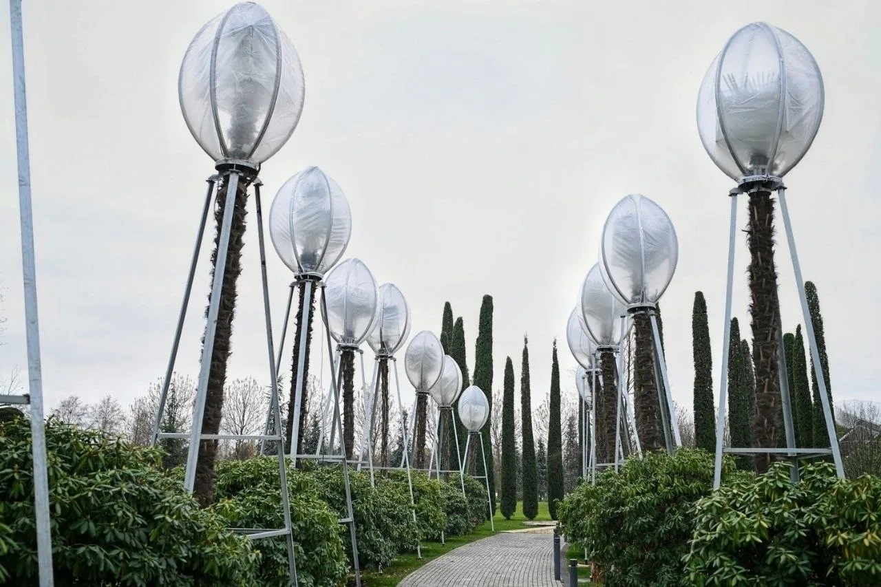 Оливы в парке аккуратно аккуратно укрыли в зимние домики.