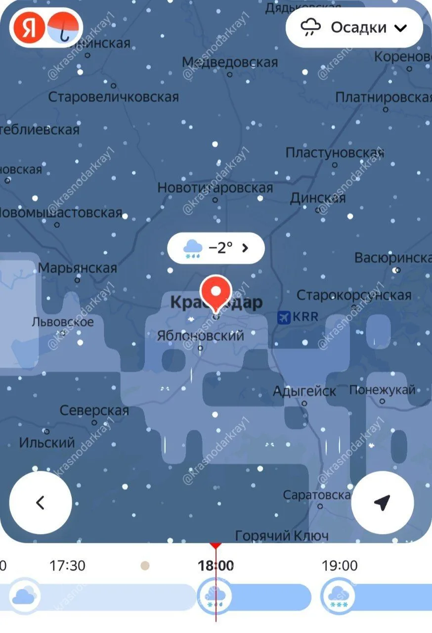 ❄️Согласно картам осадков Краснодар с 18:00 накроет мощный снегопад, который продлиться до 4 часов утра.