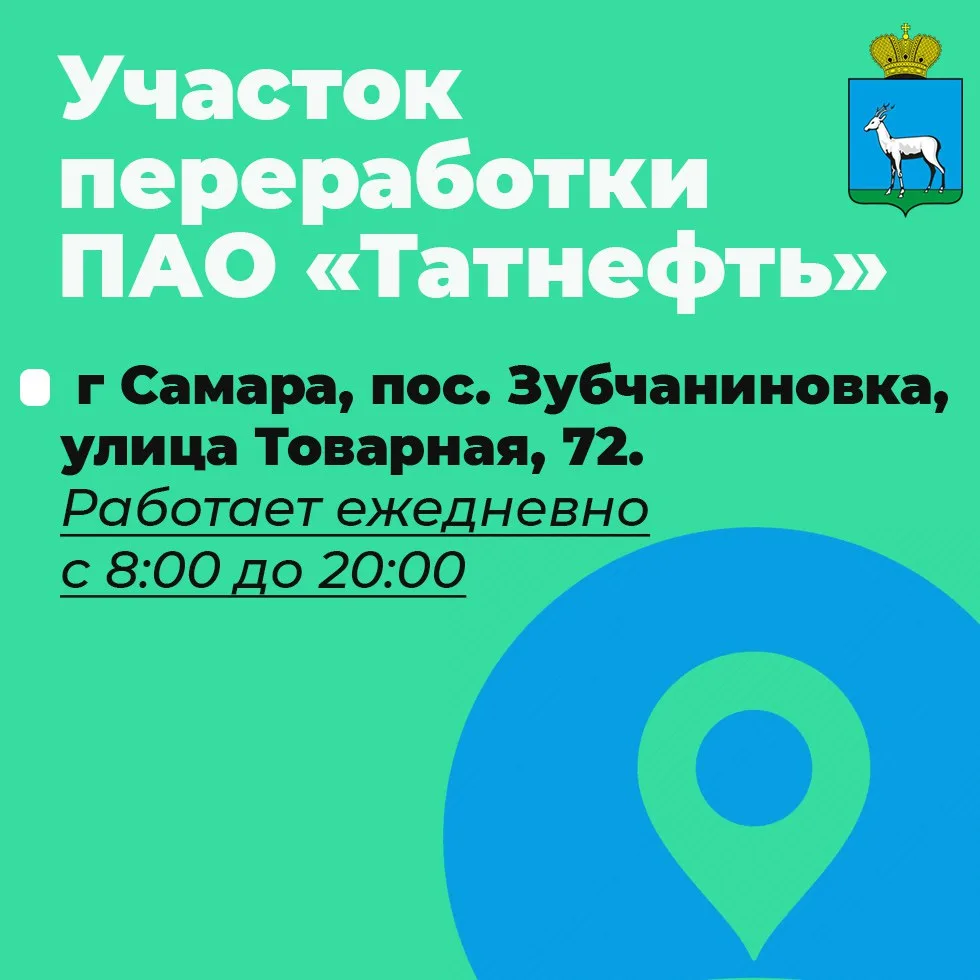 Участок переработки ПАО «Татнефть» расположен по адресу: город Самара, поселок Зубчаниновка, улица Товарная, 72 и работает ежедневно с 8:00 до 20:00.