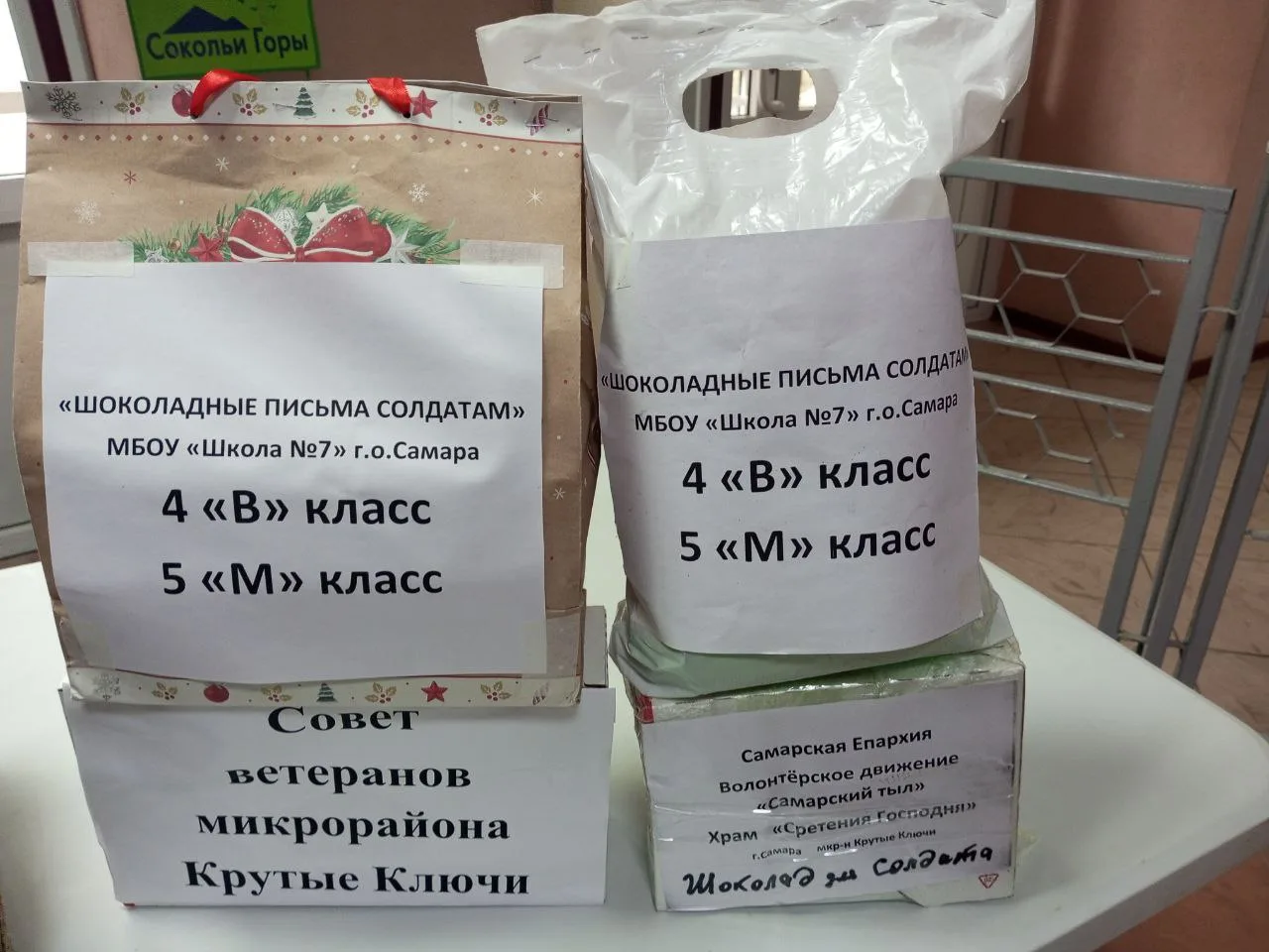 К акции «ШОКОЛАД ДЛЯ СОЛДАТ» присоединились ученики 4 "В" и 5 "М" классов МБОУ "Школа №7" г.о. Самара, волонтёры движения "САМАРСКИЙ ТЫЛ" при Храме Сретения Господня г. Самара и Совет ветеранов микрорайона Крутые Ключи.