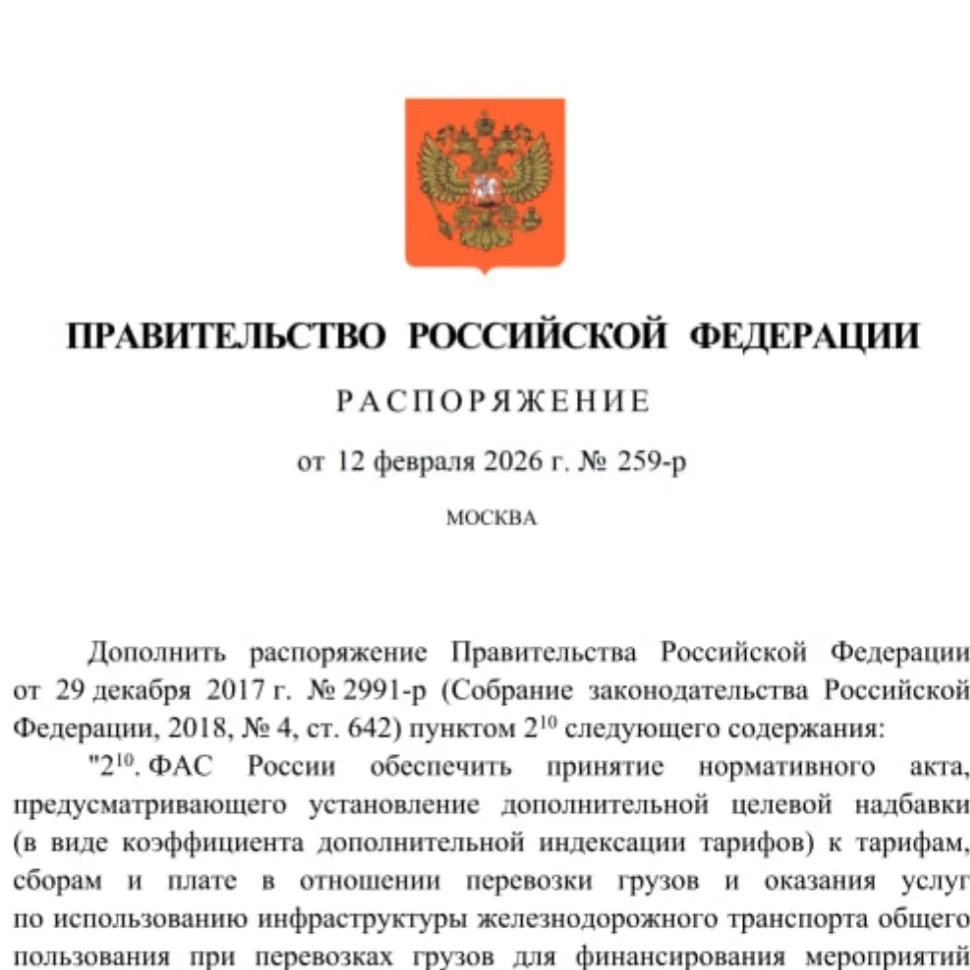 С 1 марта 2026 года тарифы Российской железной дороги на перевозки вырастут на 1%. Соответствующее распоряжение в адрес ФАС подписал председатель правительства РФ Михаил Мишустин. В документе указано, что надбавка нужна для «финансирования мероприятий по компенсации расходов, связанных с обеспечением транспортной безопасности».