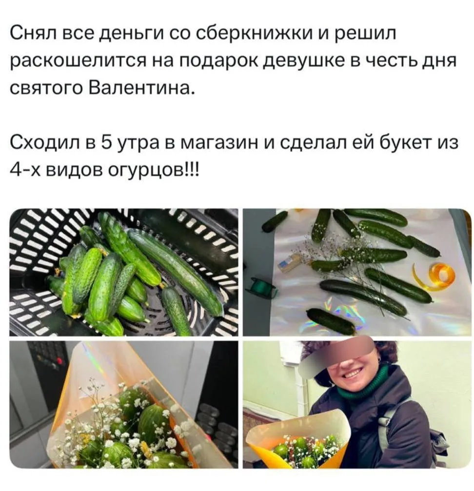 Букет из огуречного ассорти подарил молодой человек своей возлюбленной в честь 14 февраля.