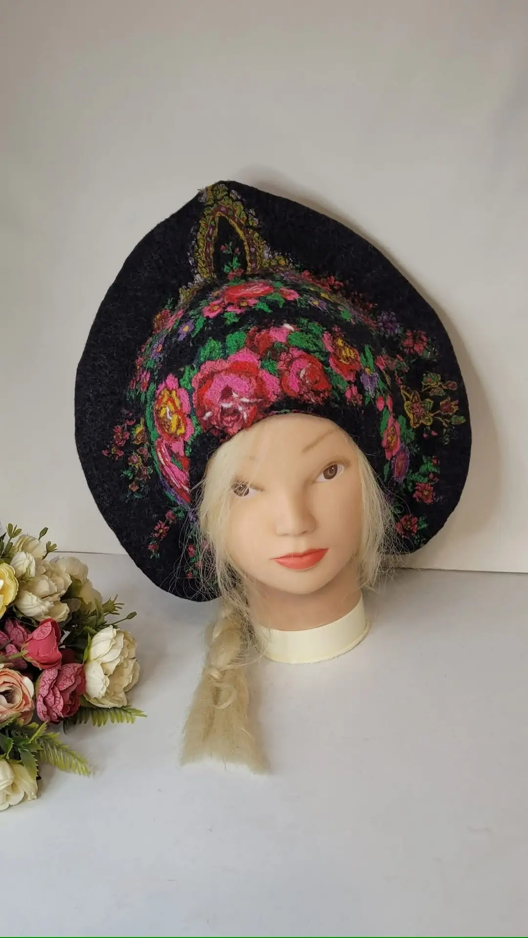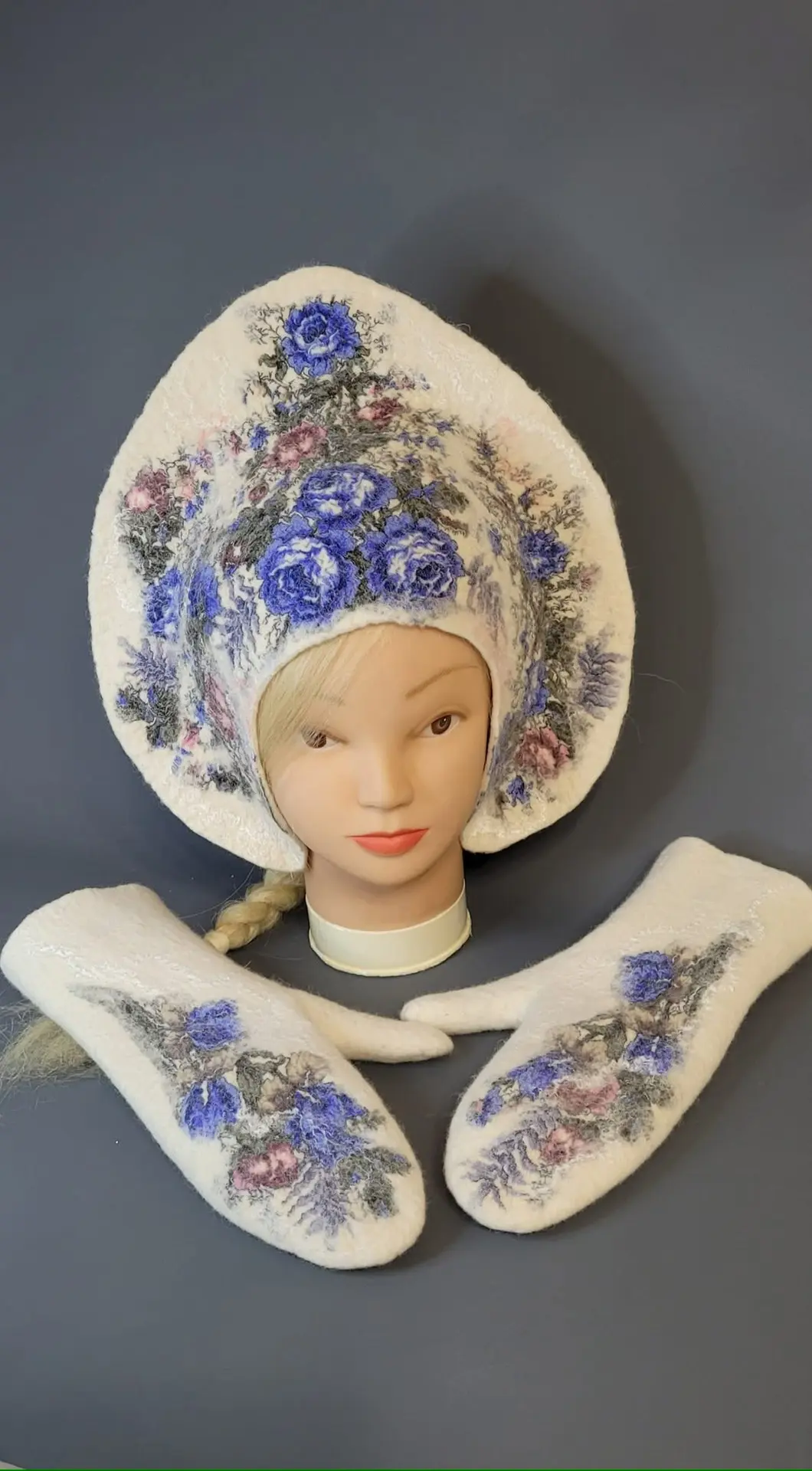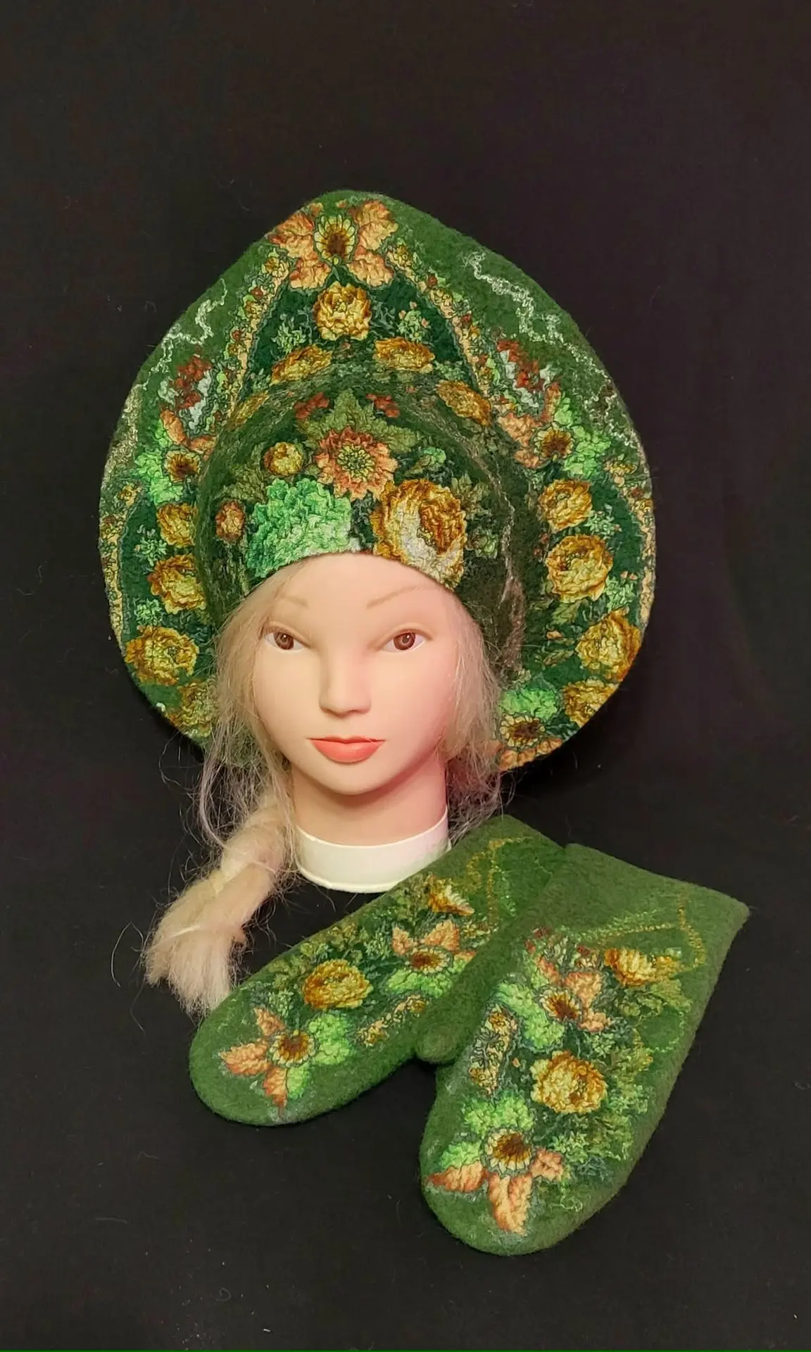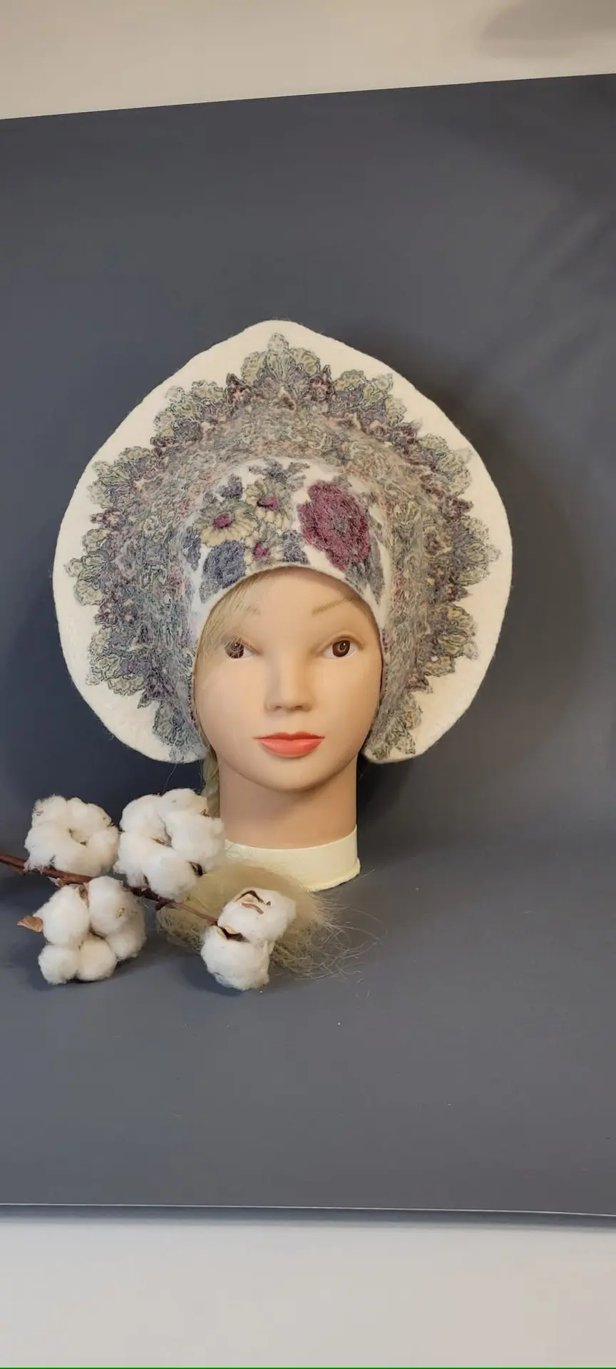 Кокошники сваляны из шерсти с добавлением фрагментов Павловопосадского платка.