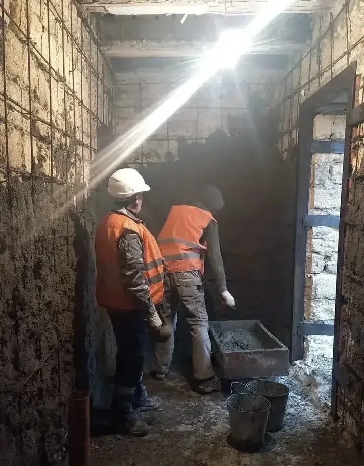 На объекте уже выполнены демонтажные и часть общестроительных работ. Продолжается оштукатуривание внутренних стен и фасада, выполняется устройство перекрытия второго этажа и обшивка чернового пола, монтаж воздуховодов системы вентиляции.